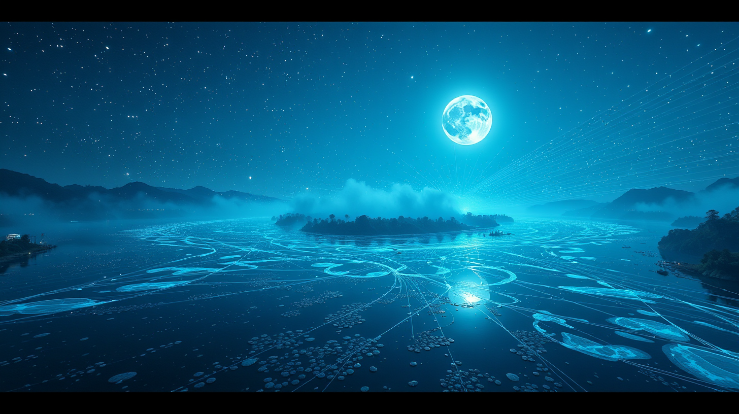 描述:暮色笼罩北江,超宽视角下,江面如墨玉般沉静。亿万纳米级量子萤火虫于月光下飞舞,在水面编织出璀璨光轨,似星河坠落人间。电磁振荡催生液态全息图案,冷蓝与墨玉色交织,水雾中光衍射如钻石碎钻。声波共鸣舟划破静谧,涟漪间光轨随节奏变换形态,一场光与水的梦幻芭蕾在此上演。