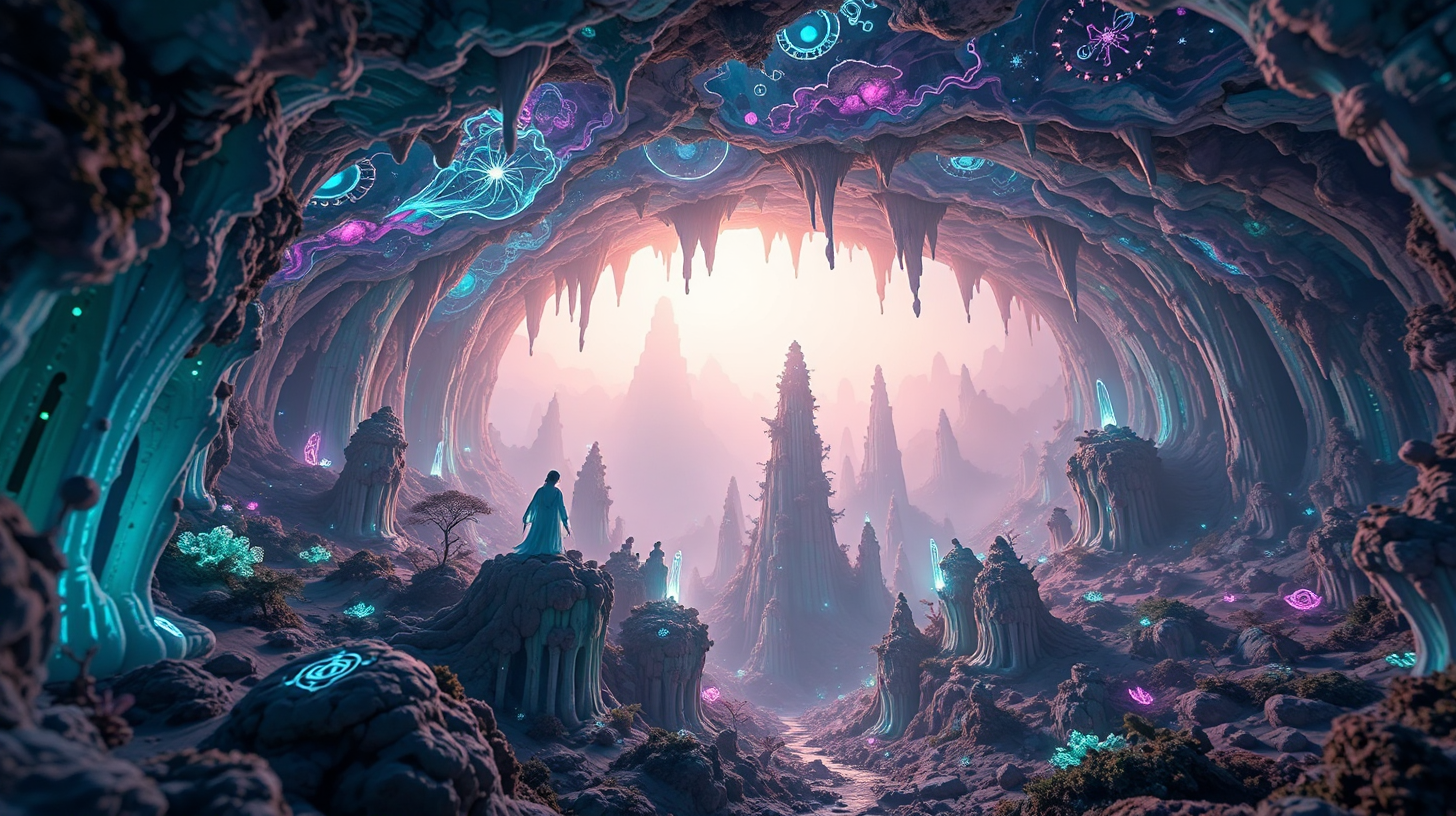 描述:喀斯特溶洞内,仰视可见半透明生态穹顶。虫视角下,量子苔藓如繁星闪烁,在钟乳石间投射星图。太赫兹扫描揭示钙化的瑶族 heritage motifs,蓝紫光谱灯光透过文石帘幕,地质 strata 的光子映射在朦胧雾气中。少年们佩戴神经接口,引导石笋生成拓扑雕塑,远古岩画在光电苔藓演绎下复活,溶洞成为自然与智慧共生的基因库,神秘莫测。