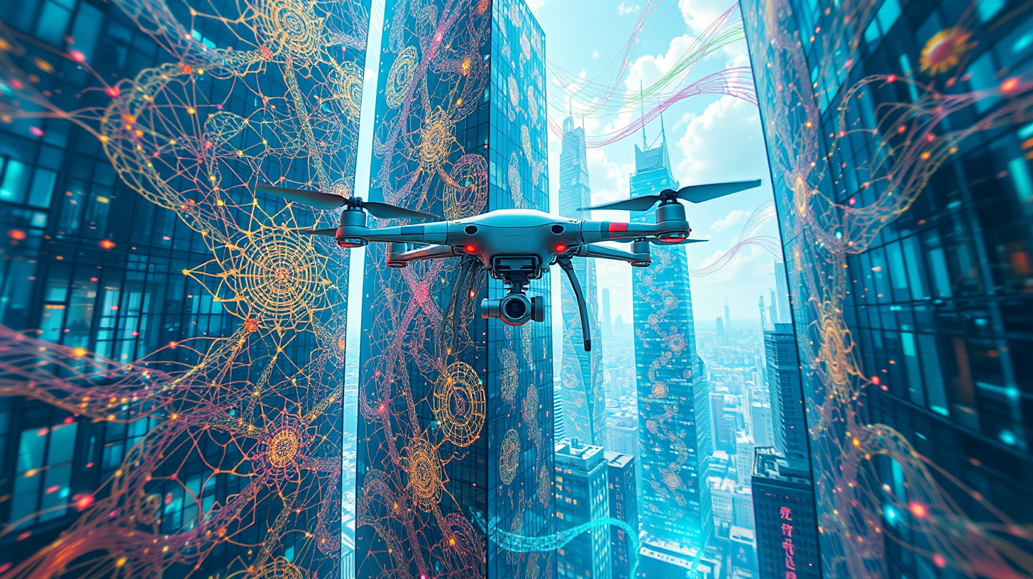 作图提示词:Vertical drone panorama of aerial weaving complex, adaptive quantum neural networks generating Zhuangjin fractals across glass facades, chromatic flux in cyan-magenta-gold spectrum creating moiré patterns, multi-rotor light trails forming dynamic Brocade algorithms, anamorphic compression blending textile geometry with urban dataflow visualizations
