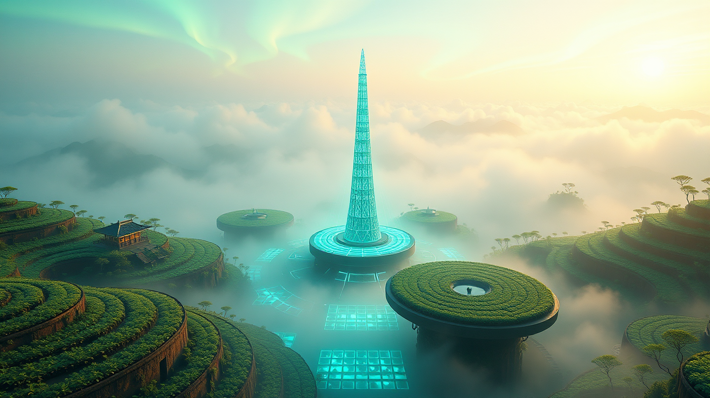 作图提示词:Aerial view of levitating quantum tea fields in dawn mist, suspended platforms radiating aquamarine energy grids, resonance spire emitting synchronized light waves across floating terraces, dynamic holograms demonstrating traditional tea-processing techniques, wide-angle composition with rule-of-thirds framing capturing mist gradients blending with electromagnetic auroras, Fujifilm GFX 100S medium format clarity with cinematic depth of field