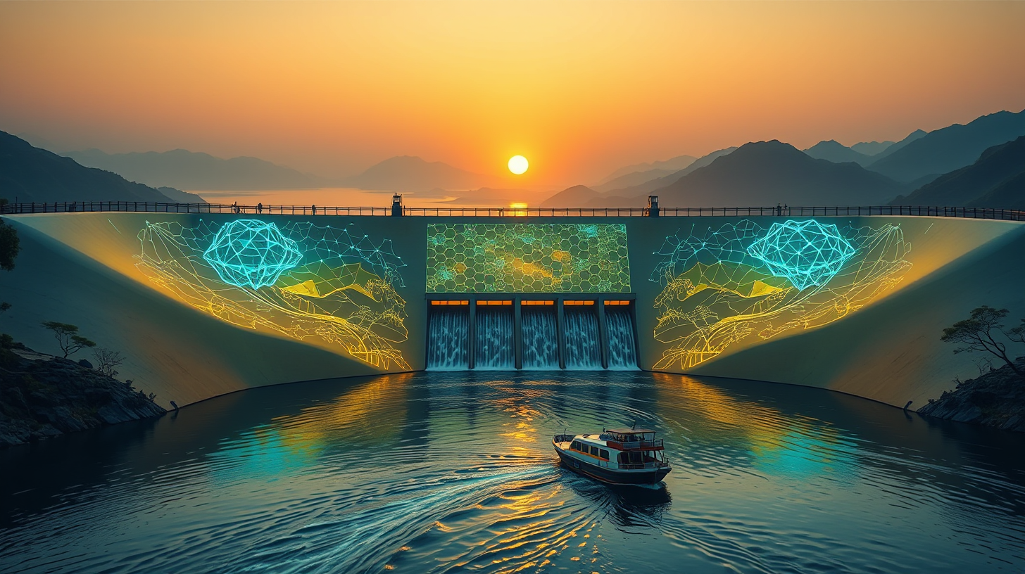 作图提示词:Medium shot of Yellow River smart dam at sunset, hydrokinetic projectors casting adaptive water management diagrams across curved surfaces. Hexagonal nano-collectors self-assemble from smart boats, creating energy matrices reflected in fluid dynamics. Eco-hydraulic systems display ancient irrigation principles through chromatic depth-of-field, amber ambient light balancing cyan holographic overlays. Symmetrical composition with leading lines following river flow, long exposure capturing light refraction patterns.