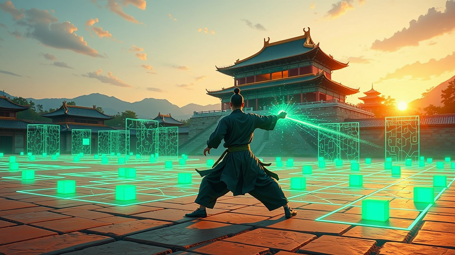 描述:少林寺遗址上,神经接口矩阵塔如莲花般耸立,晨光中,武僧与AI共同演练新型强身算法。年轻程序员将代码写入武学套路,AR梅花桩上,防拥堵交通模型随着拳法不断进化。练功场的压力感应地砖与空中悬浮的武术动作分解投影相映成趣,残存经幢被改装成算法演示柱,流转着《易筋经》代码。AR桩阵的翡翠绿轨迹光与残垣断壁间的藏蓝数据流荧光交织,武学传承的炽热与量子计算的冷冽在此激烈碰撞,钟磬余韵与算法迭代声在塔林间形成独特驻波。