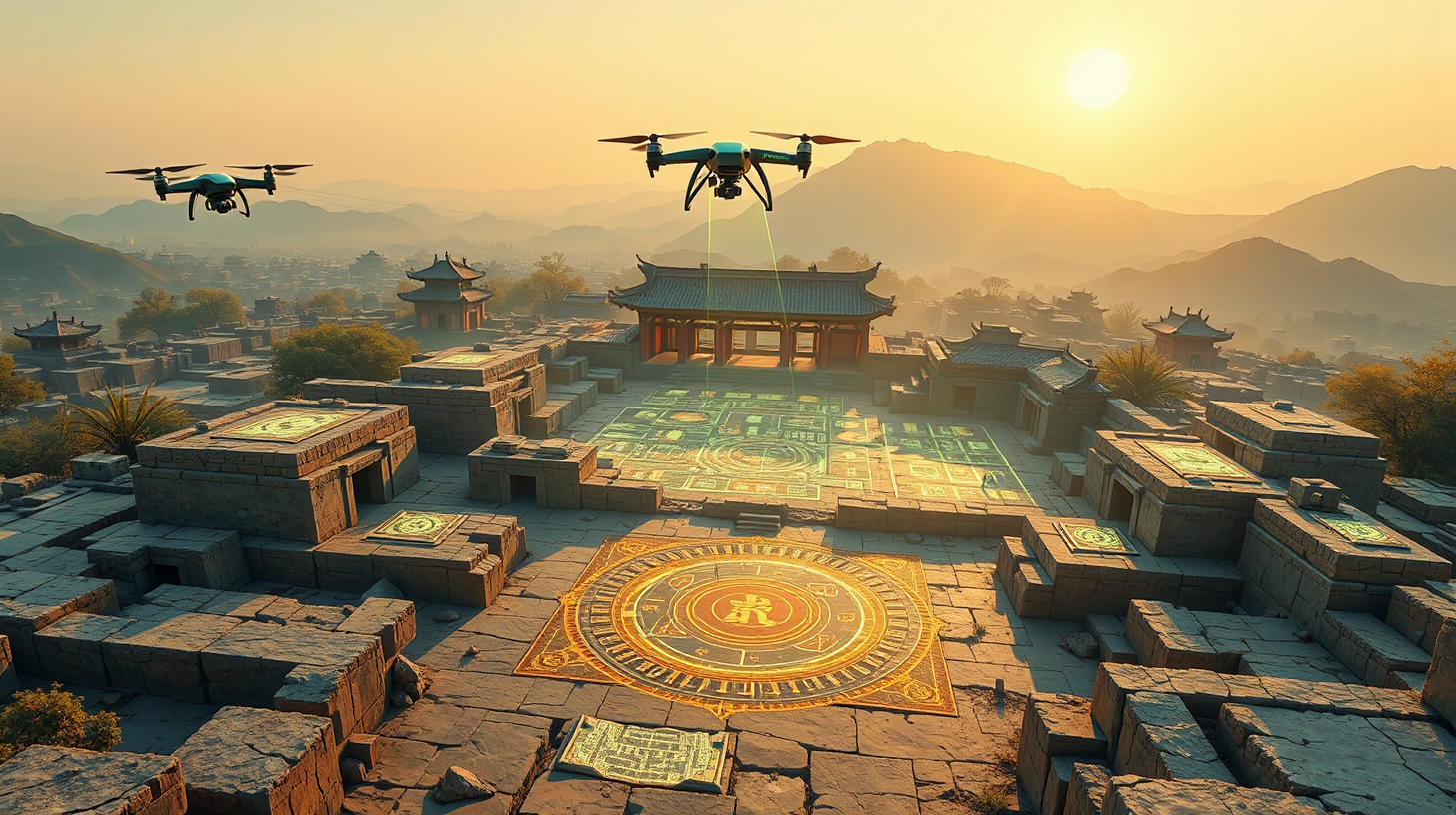 作图提示词:Aerial view of Zhengzhou Shang Dynasty ruins at dawn, 21st-century nanotechnology reconstructing bronze patterns through luminous data streams. Archaeological drones mapping terrain with LiDAR grids, laser scanners revealing hidden inscriptions under angled sunlight. Holographic energy diagrams pulse with oracle bone arrangements, golden photons interacting with patina-green quantum projections. Cinematic composition with rule-of-thirds framing, shallow depth of field emphasizing data-particle interactions on weathered stone surfaces.