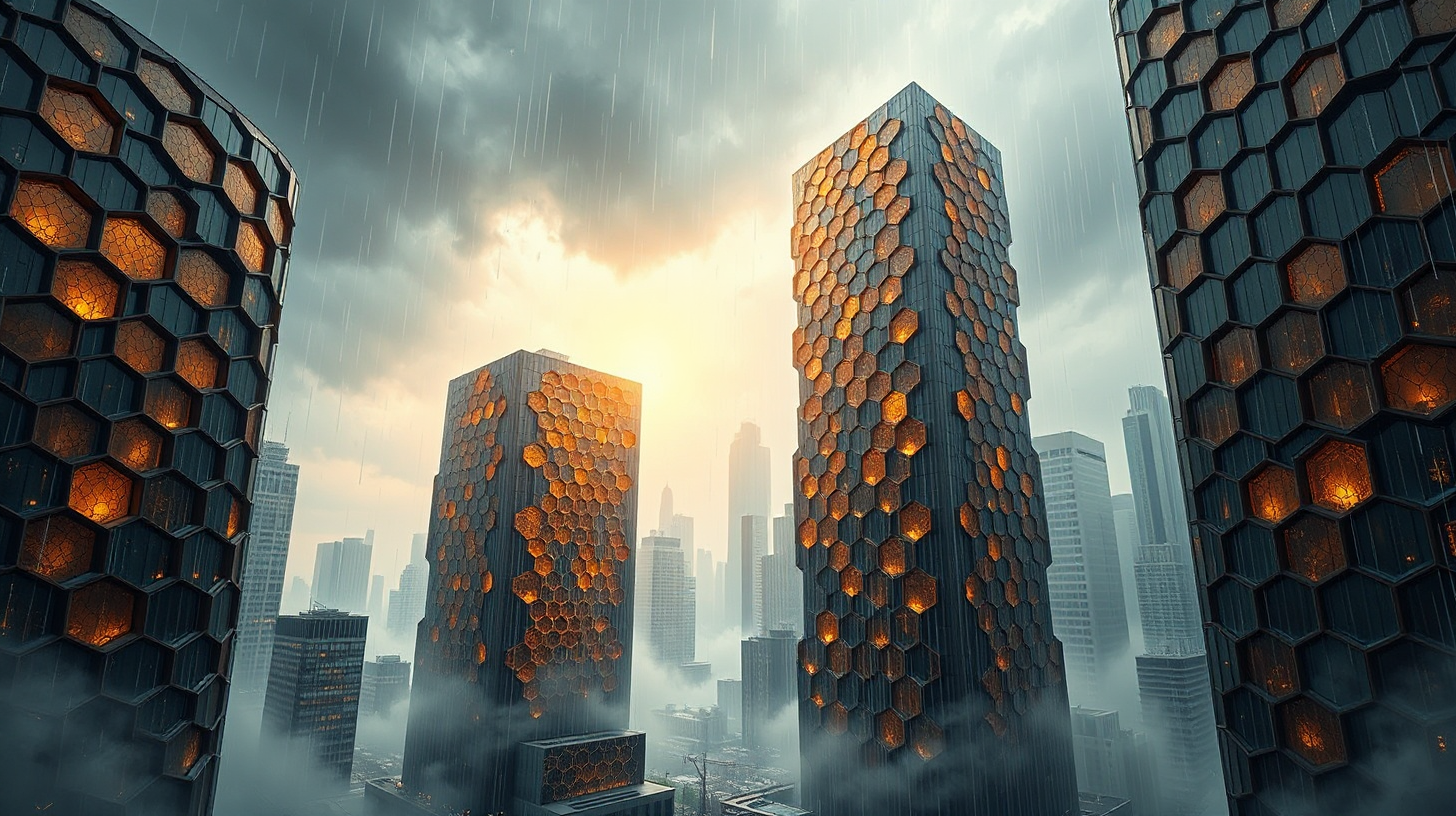 作图提示词:Aerial wide-shot of modern skyscrapers morphing into hexagonal honeycomb structures during heavy rain, nano-repair fluid flowing down geometric facades embedded with Bronze Age patterns, storm lighting creating chiaroscuro effects through transforming architectures, color scheme combining bronze patina with hydrodynamic steel, captured with deep focus using 24mm lens, cyber-organic fusion style.
