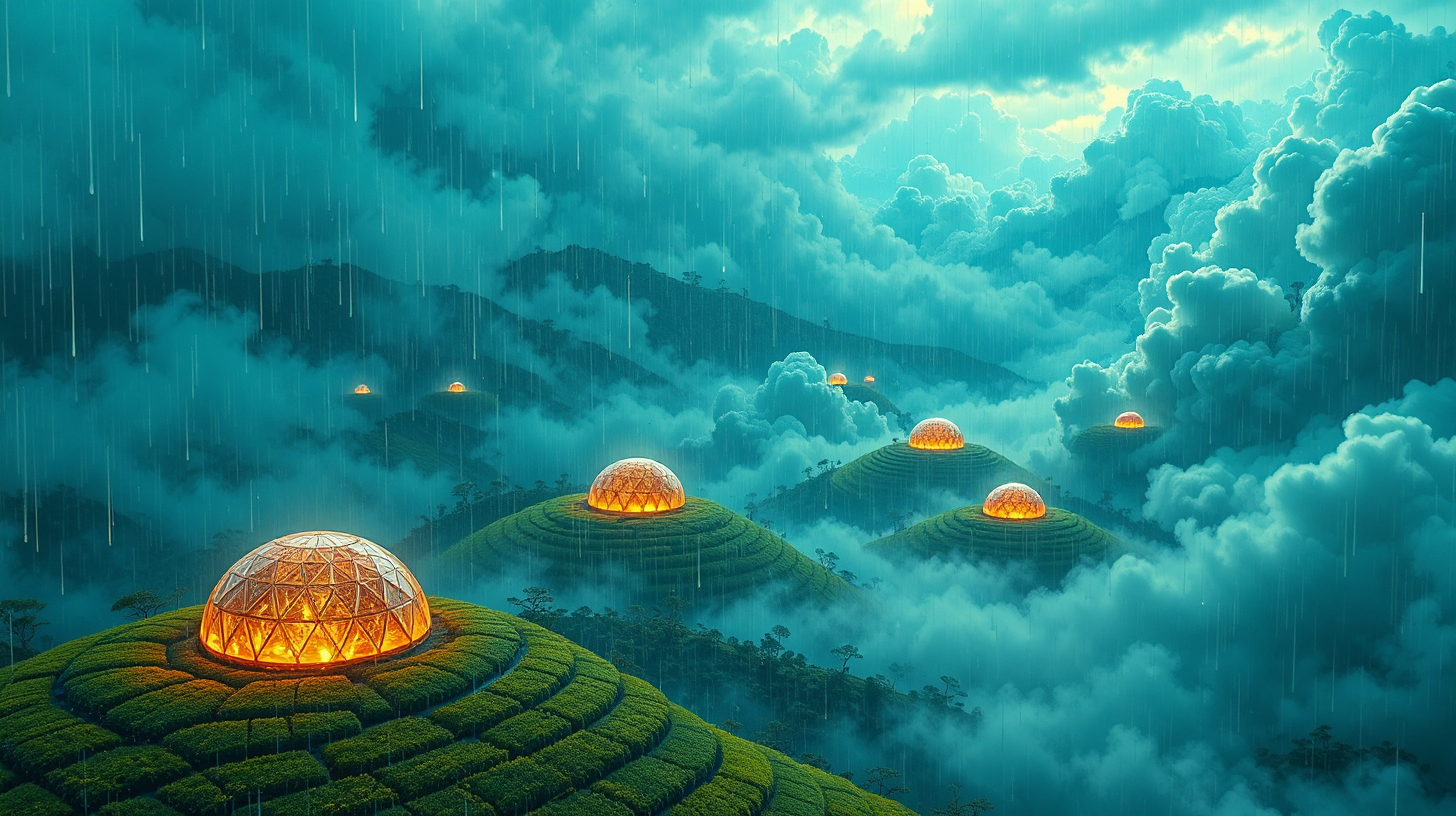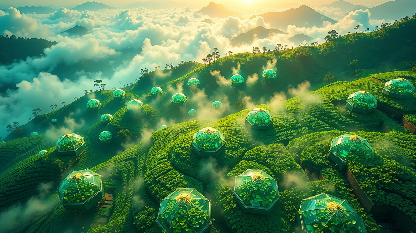 作图提示词:Aerial view of hexagonal greenhouses suspended in dawn light, quantum mist rising from Dabie Mountain nourishing levitating tea cultivars. Bioluminescent energy flows through leaf networks creating chromatic diffraction across terraces. Captured with wide-angle lens at f/8, 1/250s exposure emphasizing dynamic energy patterns, color grading emphasizing jade-green and holographic gold tones.
