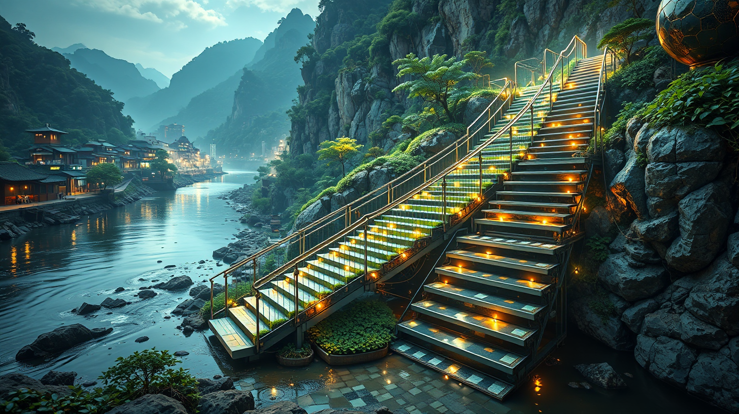 作图提示词:Adaptive alloy staircase along Pi River dynamically reconfiguring between historical tea transport grooves and modern logistics channels. Holographic timelines projected through refractive surfaces revealing processing evolution. Shot at 35mm focal length with focus stacking, using long exposure to capture light trail temporal layers and metallic surface refraction effects.