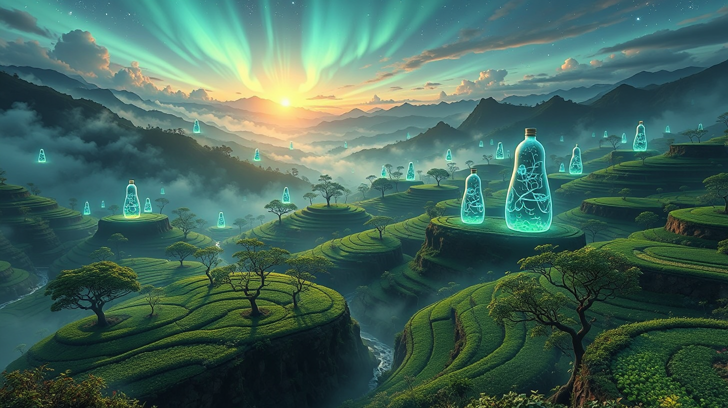 描述:晨光以45度角切割透明碳晶材质的六棱柱温室,七重光谱在螺旋悬浮的茶田间折射出流动彩虹。量子雾自山体岩层涌出,带着淡金色辉光包裹茶树,根系在空中编织成发光矩阵,叶片脉络随能量流动泛起液态阳光般的金色涟漪。空气里跃动着光粒子的嗡鸣,茶田宛如呼吸着的有机电路板,低频共振与光粒碰撞的脆响交织成自然与科技的协奏。
