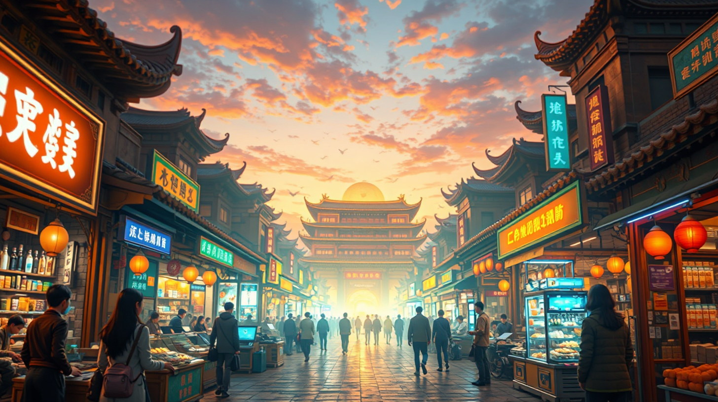 作图提示词:Digital Silk Road market with holographic resonance fields between stalls, augmented reality interfaces projecting Dunhuang color schemes, merchants with optical implants displaying commodity data streams, warm ochre and chromatic gold lighting under dusk sky, wide dynamic range capturing both neon projections and traditional architectural details using tilt-shift perspective