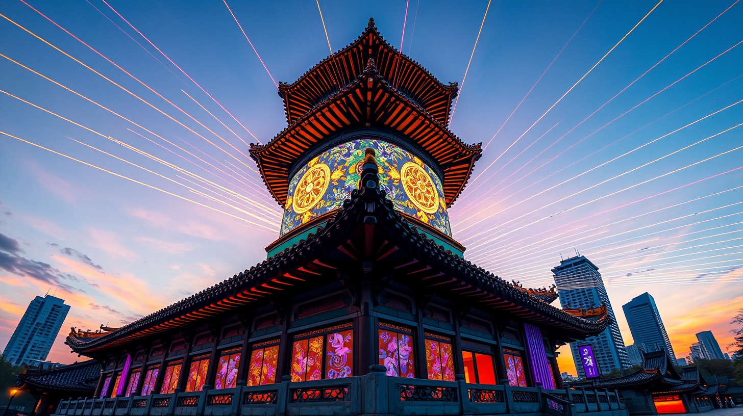 作图提示词:Dusk-lit bell tower with prismatic light arrays cascading down glazed eaves, authentic Tang dynasty patterns projected via phased-array holography in twilight, warm saffron and amethyst hues blending traditional architecture with photonic displays, low-angle fisheye lens exaggerating curved roof lines against modern skyline, long exposure capturing light calligraphy in air using RGB laser grid systems