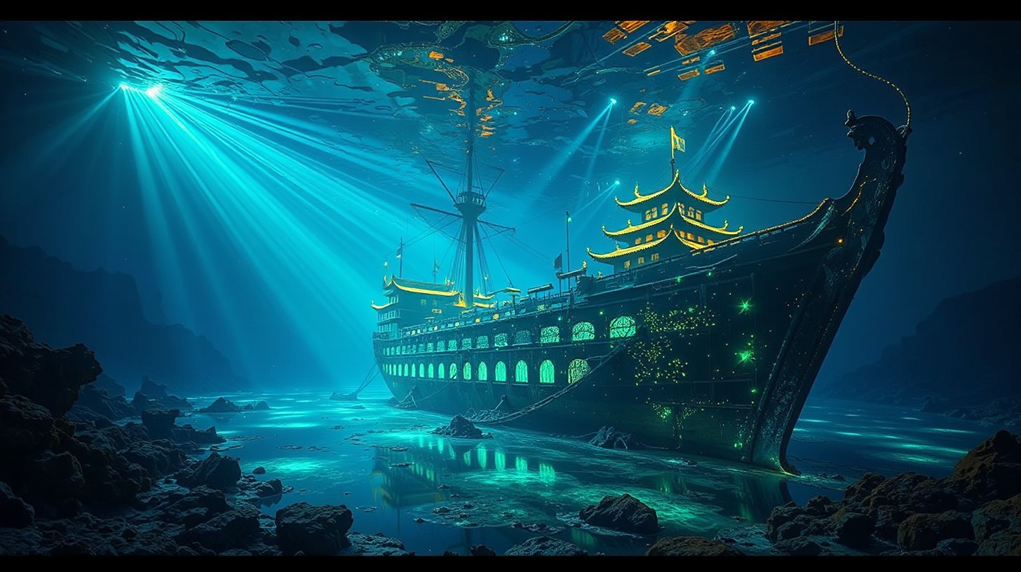 作图提示词:Submerged Tang shipwreck in Qujiang Pool illuminated by pulsating conservation nodes, bioluminescent nano-clusters outlining architectural remains, emerald and cobalt lighting through aqueous medium creating caustic patterns, wide-angle view capturing sediment particles in light beams, color temperature shifting from warm relic gold to cool preservation blue