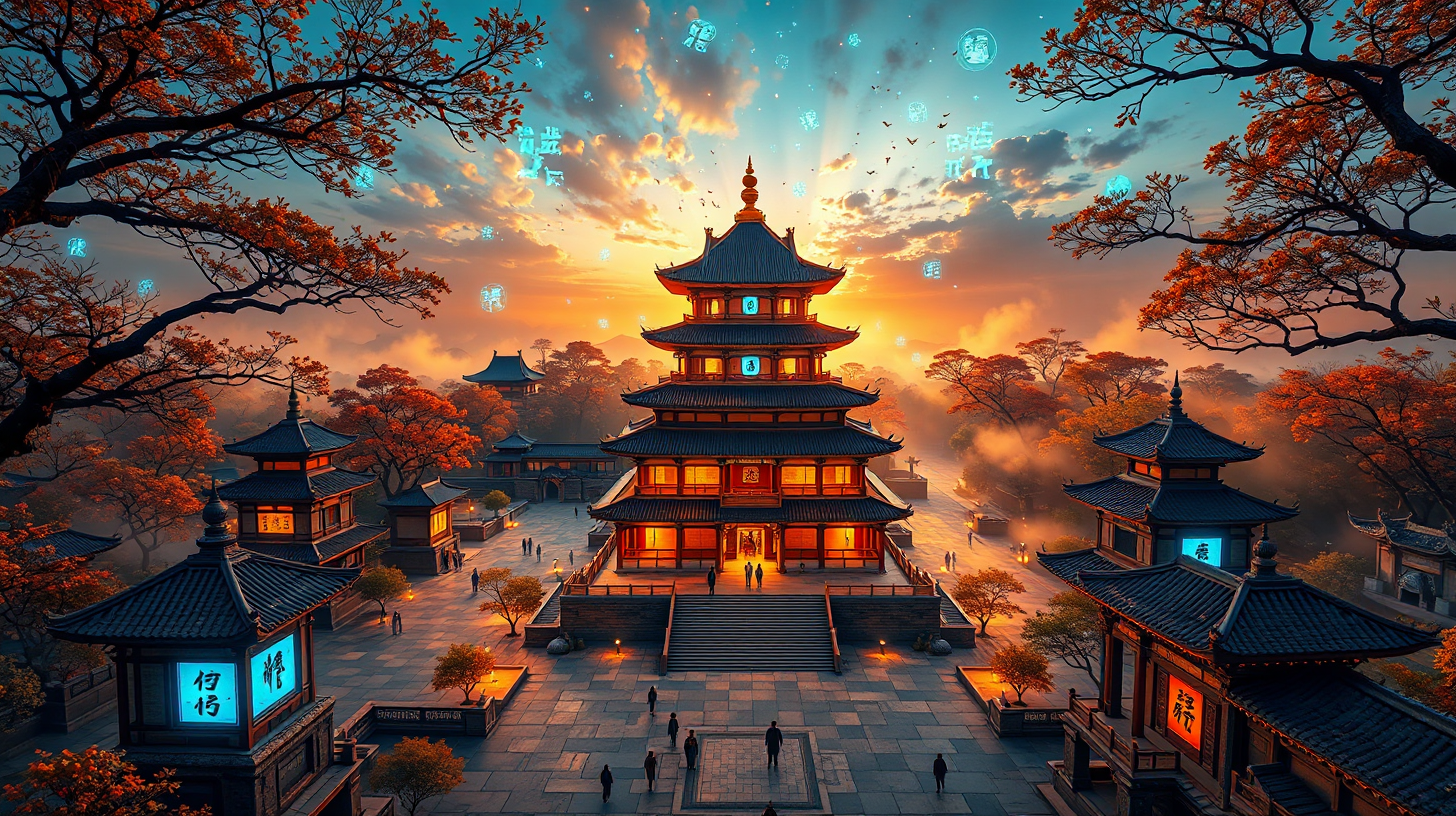 描述:考古型纳米雾如流动的银丝漫过大雁塔广场,千年塔身在量子辉光中若隐若现。慈恩寺古槐舒展光脉枝条,每片叶子都在虚空中书写《大唐西域记》的数码残章——梵文偈语与二进制代码交织成发光藤蔓,缠绕着琉璃瓦当。悬浮的程序诗将历代题记转化为几何光影,当少男少女追逐晨露时,露珠碰撞间竟将他们的想象物质化:玄奘的全息身影与量子物流无人机共舞,碑林碑文化作漂浮的发光字符,在晨雾中织就穿越时空的诗笺。