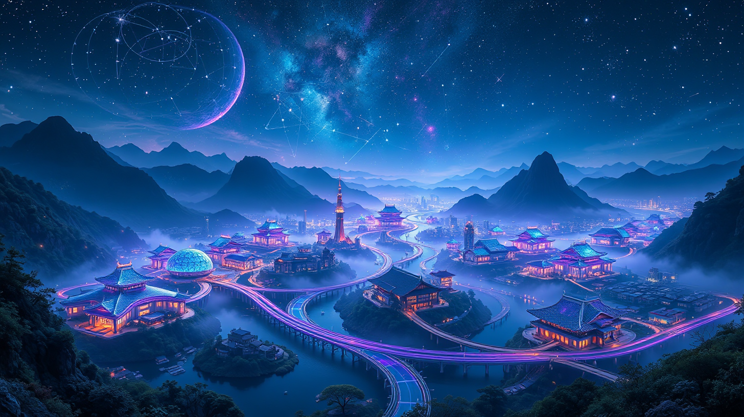 作图提示词:Ultra-wide night panorama showing quantum-entangled waterways connecting Qinling Mountains to urban systems. Architectural clusters pulse with neural synchronization patterns, their curved roofs outlined by violet biophotonic emissions. Nanotech walls display liquid crystal constellations while airborne mist particles refract holographic star maps. Shot with tilt-shift lens at f/16 aperture, combining long exposure light trails with raytraced illumination ranging from deep-space violet to quantum blue, rendered with HDR10+ dynamic range.