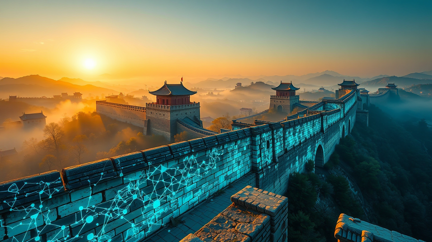 作图提示词:Ancient Xi’an city wall at dawn with cybernetic fractal patterns glowing cyan across weathered stones, geometric light projections simulating nano-restoration, morning mist diffusing golden sunlight through merlon gaps, aerial composition balancing massive fortifications with delicate holographic interfaces using cold cerulean and warm amber tones, depth of field emphasizing texture contrast between ancient stone and translucent tech layers