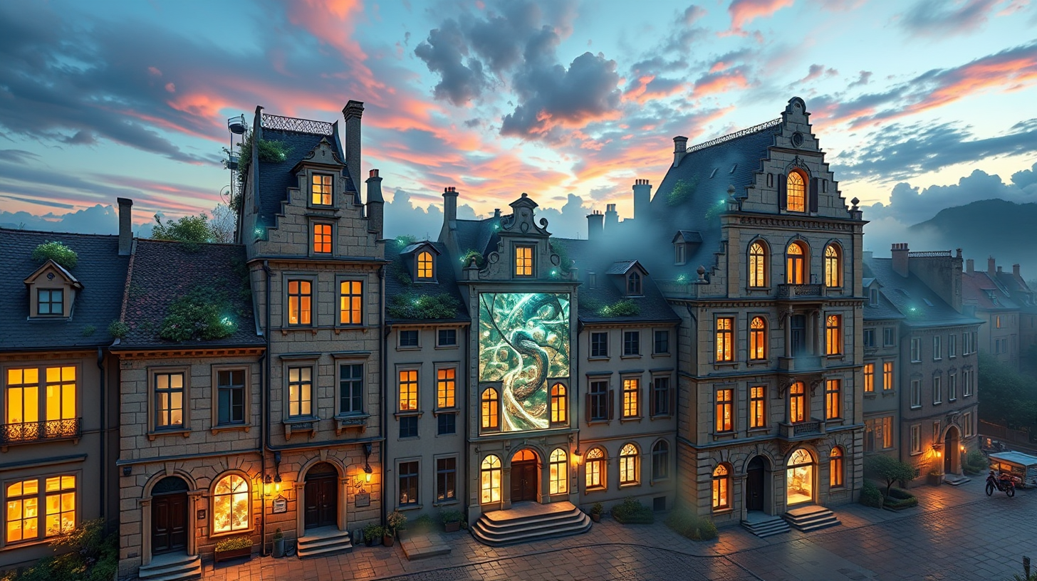 描述:晨雾中的百年德式建筑群被翡翠色的量子苔藓矩阵覆盖,发光微生物沿着巴洛克雕花穹顶自主修复,神经接口与苔藓共鸣,将失传的彩玻窗图案投射在雾气幕墙上。建筑立面的科林斯立柱流动着修复光纹,臭氧与海水的气息在晨光中交织,展现科技与历史在分子层面的肃穆交融。