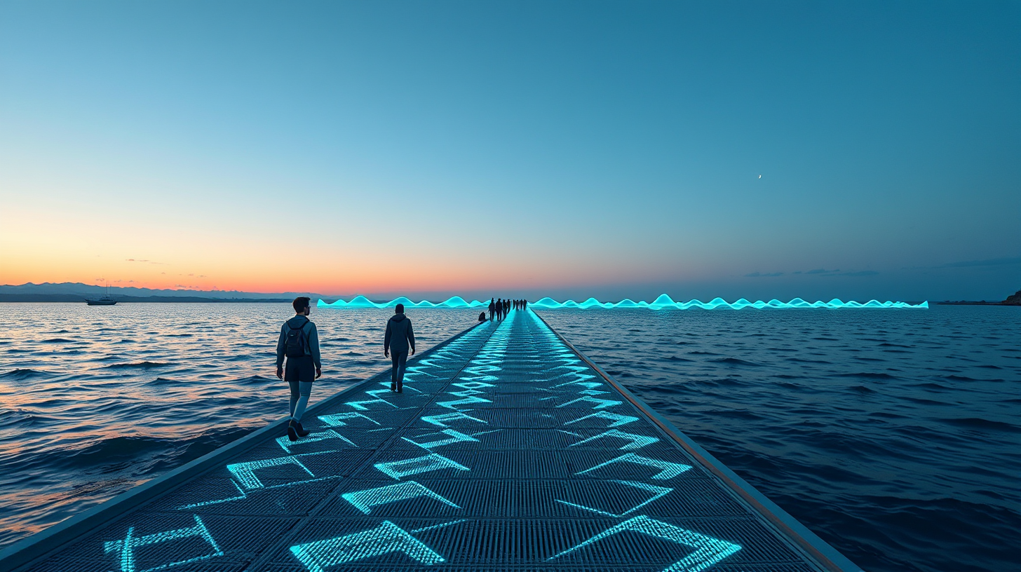 作图提示词:Medium telephoto composition of phased-matter boardwalk extending beyond horizon, piezoelectric lattice harvesting wave energy into pulsating cyan waveforms, visitors’ footfalls generating optogenetic marine holograms synchronized with tidal phases, captured at nautical twilight with Arri SkyPanel S360-C lighting effects emphasizing sub-surface scattering
