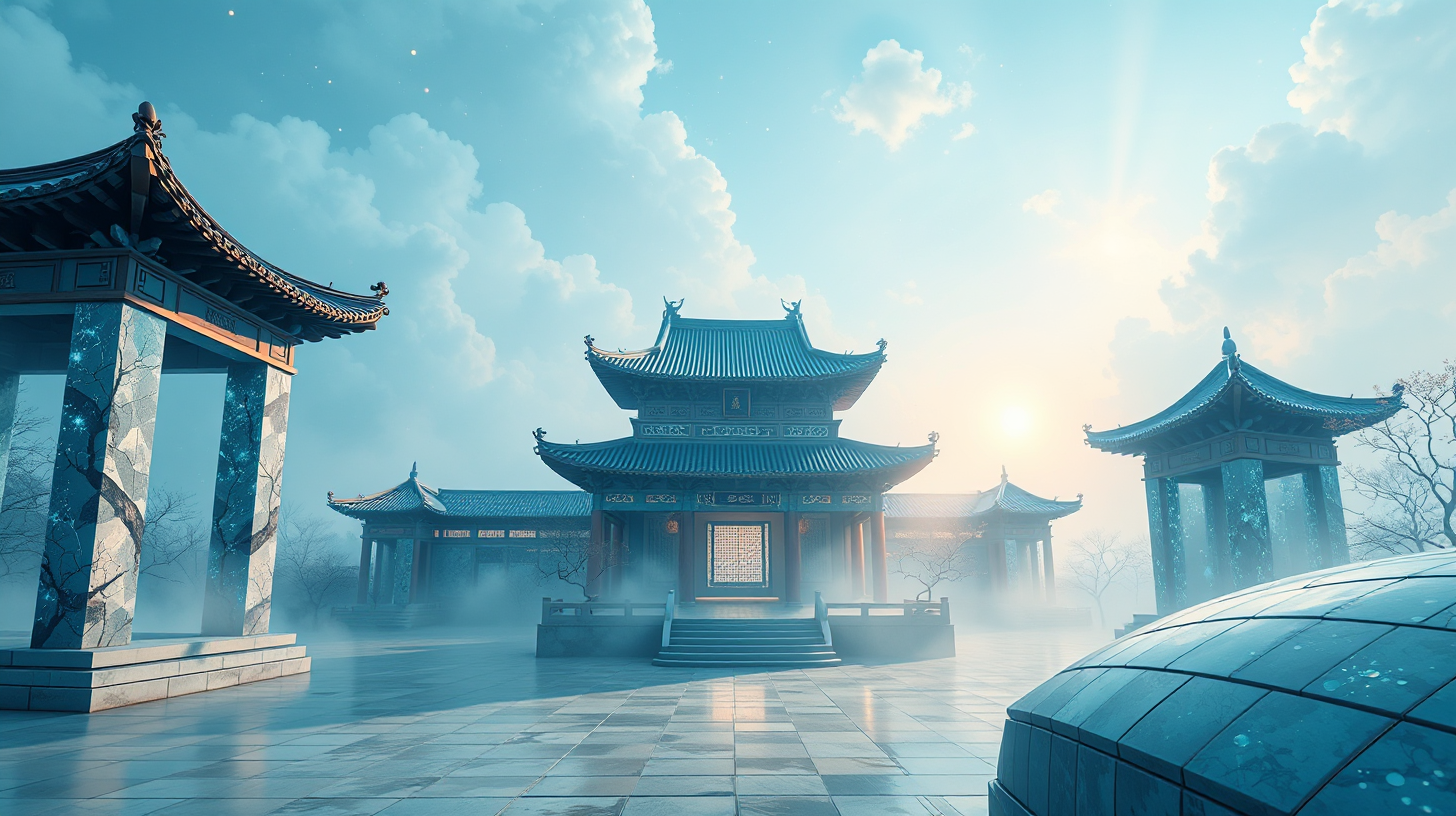 作图提示词:Aerial composition using wide-angle perspective capturing Badaguan’s quantum-enhanced stone roofs shimmering through magnetic levitation mist, holographic gallery pillars blending Song Dynasty motifs with particle physics visualizations, multi-layered depth-of-field revealing AI-generated ink wash animations in atmospheric haze, dawn’s axial light refracting through prismatic nanodroplets, cyber-flora with phototropic vines adapting luminosity to architectural contours, cool cerulean tones transitioning to pearlescent highlights on curved tile surfaces