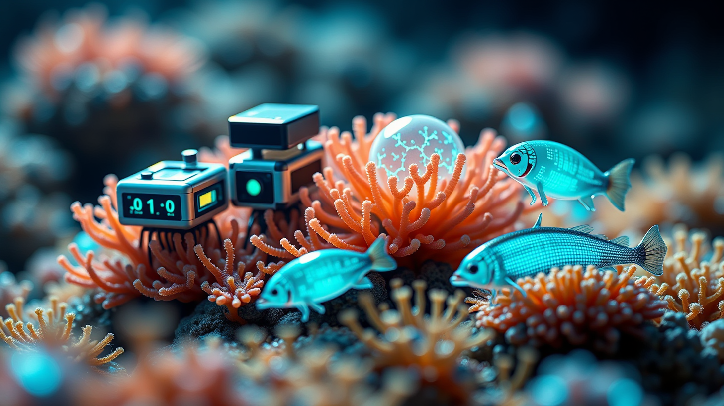 作图提示词:Macro shot of pelagic research cluster with phototrophic computation modules, symbiotic coral-quantum hybrids emitting Cherenkov radiation patterns, CRISPR-modified plankton displaying real-time data streams through bioluminescent coding, captured with Laowa 24mm probe lens at f/32 for maximum depth of field, using controlled specular highlights to differentiate organic and synthetic components