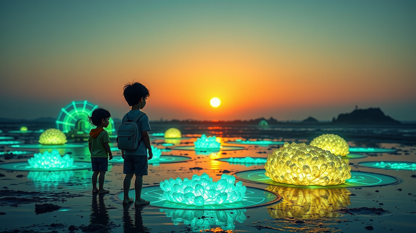 作图提示词:Medium depth shot framing children’s silhouettes against bioluminescent tidepools, programmable algae forming Fibonacci light sequences on wave-dissipation structures, shorebots with cellulose-filter containers casting chromatic aberration glows, golden hour backlighting accentuating sand’s nanocomposite crystals, interactive holograms projecting Jiangsu embroidery patterns onto tidal surfaces, dual-tone gradient from phthalo turquoise to deep abyssal greens with specular highlights on wet sediment