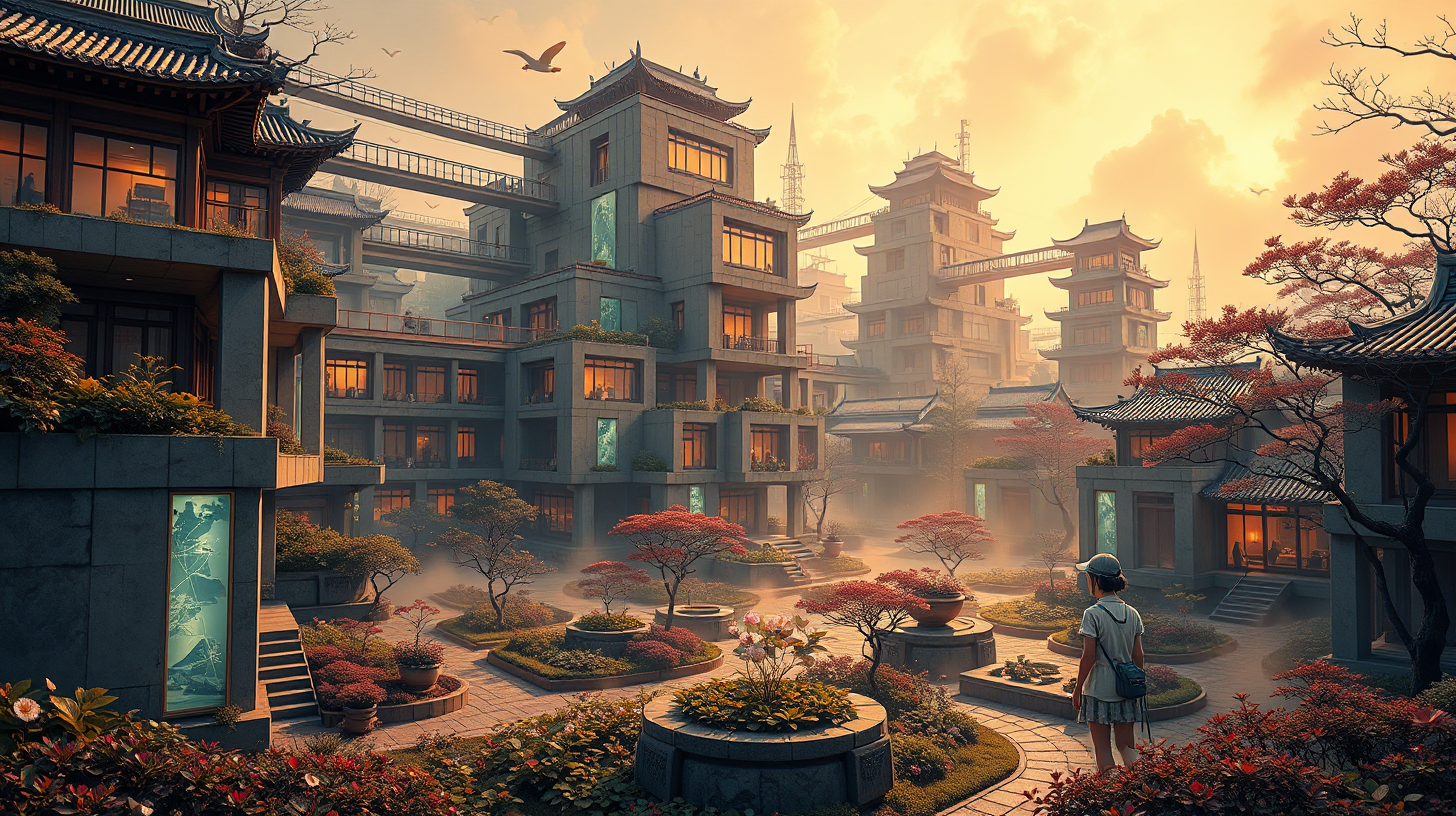 描述:卯时的晨光洒向钟鼓楼,模块化重组系统在此刻启动。原本坐落于地面的四合院群如同被赋予了魔力,如魔方般缓缓升空,在空中进行着奇妙的重组。悬浮走廊在半空中交织成脑神经的形态,连接着各个四合院单元。空中花园里,量子茶馆正将晨雾编译成散发着淡淡清香的记忆拿铁,琉璃瓦当在微风中叮咚作响,奏响一曲拓扑学版的《晨钟暮鼓》,展现出机械运转的精密感与老北京生活气息的奇妙融合。