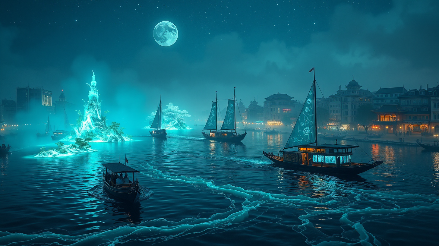 描述:夜幕下的大运河故道,不再是传统印象中的平静水面,而是涌动着幽蓝的光流,仿佛是一条流淌着暗物质的神秘河流。人体生物电采集浮岛漂浮在水面上,它们随着水流的方向不断重组形态,如同一个个活的生命体。漕运古船以反重力的姿态在运河中穿梭,船首像实时投射出量子修复的运河诗碑,那些古老的文字在光的映衬下显得格外清晰。水面上漂浮着发光古籍残页形态的数据节点,反重力引擎的低声嗡鸣与数字水纹特有的电子潺潺声在夜空中回荡,营造出一种神秘与宁静交织的氛围。