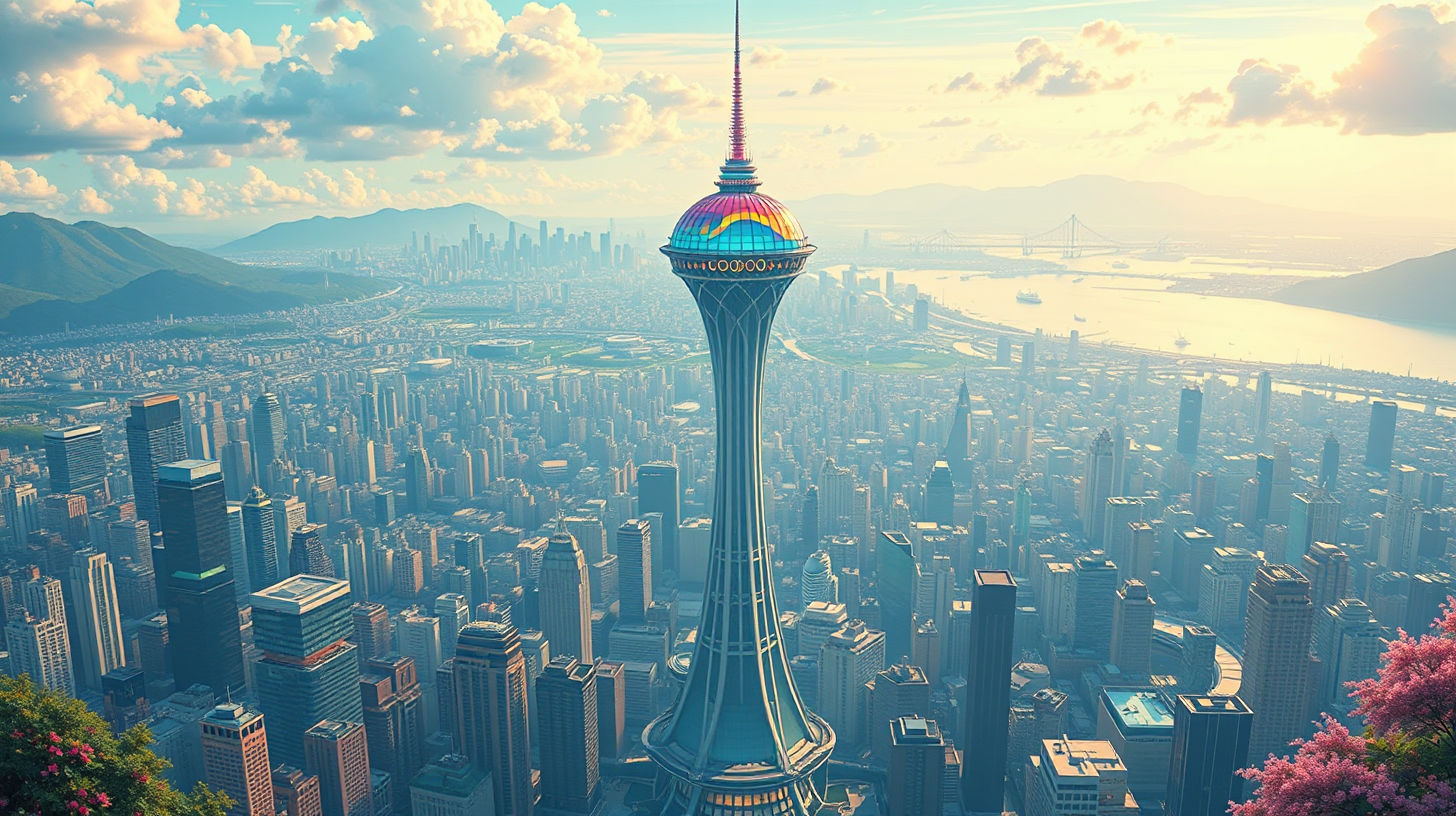 描述:奥运塔顶,一个巨大的情感光谱穹顶正在绽放,它随着城市的情绪指数不断变幻着色彩,从温暖的橙红到宁静的湛蓝,仿佛是天空的情绪晴雨表。市民们佩戴着神经传感玉佩,聚集在鸟巢周围,进行着年度的脑波交响。鸟巢的钢结构随着集体情绪的频率,生长出一片片发光的藤蔓矩阵,它们在夜空中闪烁着柔和的光芒。空气中弥漫着可视化的声波,集体脑波共鸣产生的次声波震动与发光藤蔓生长的晶体脆响交织在一起,构成了一场庆典般的科技狂欢与深层心灵共鸣并存的盛宴。