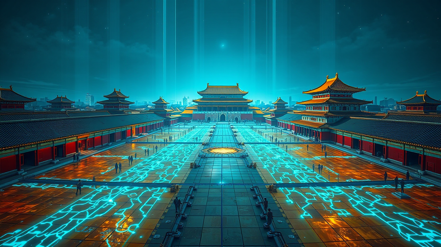 作图提示词:Futuristic Forbidden City panorama with pulsating neural networks embedded in golden glazed tiles, maintenance nanobots emitting soft cyan trails across courtyards, holographic dynasty projections aligned on central axis using 3D laser grids, ultra-wide angle lens capturing depth of field from glazed tile close-ups to distant digital pagodas, cinematic lighting blending vermilion architectural elements with bioluminescent blue energy flows