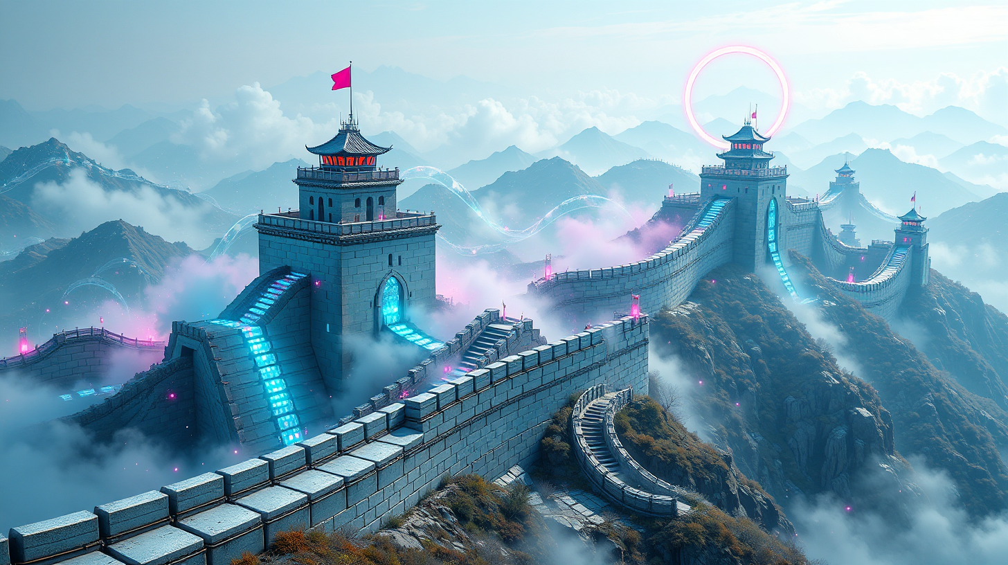 作图提示词:Dynamic topological structure of the Great Wall with luminescent memory capsules embedded in self-repairing alloy bricks, quantum data streams cascading across fractal-patterned metallic surfaces, watchtowers emitting quantum entanglement halo projections, morning mist diffusing through morphing hexagonal fortifications, rendered with ultrawide perspective emphasizing parametric architecture details, shallow depth of field highlighting glowing capsules against cold-toned titanium surfaces, cinematic lighting with cyan-magenta chromatic accents