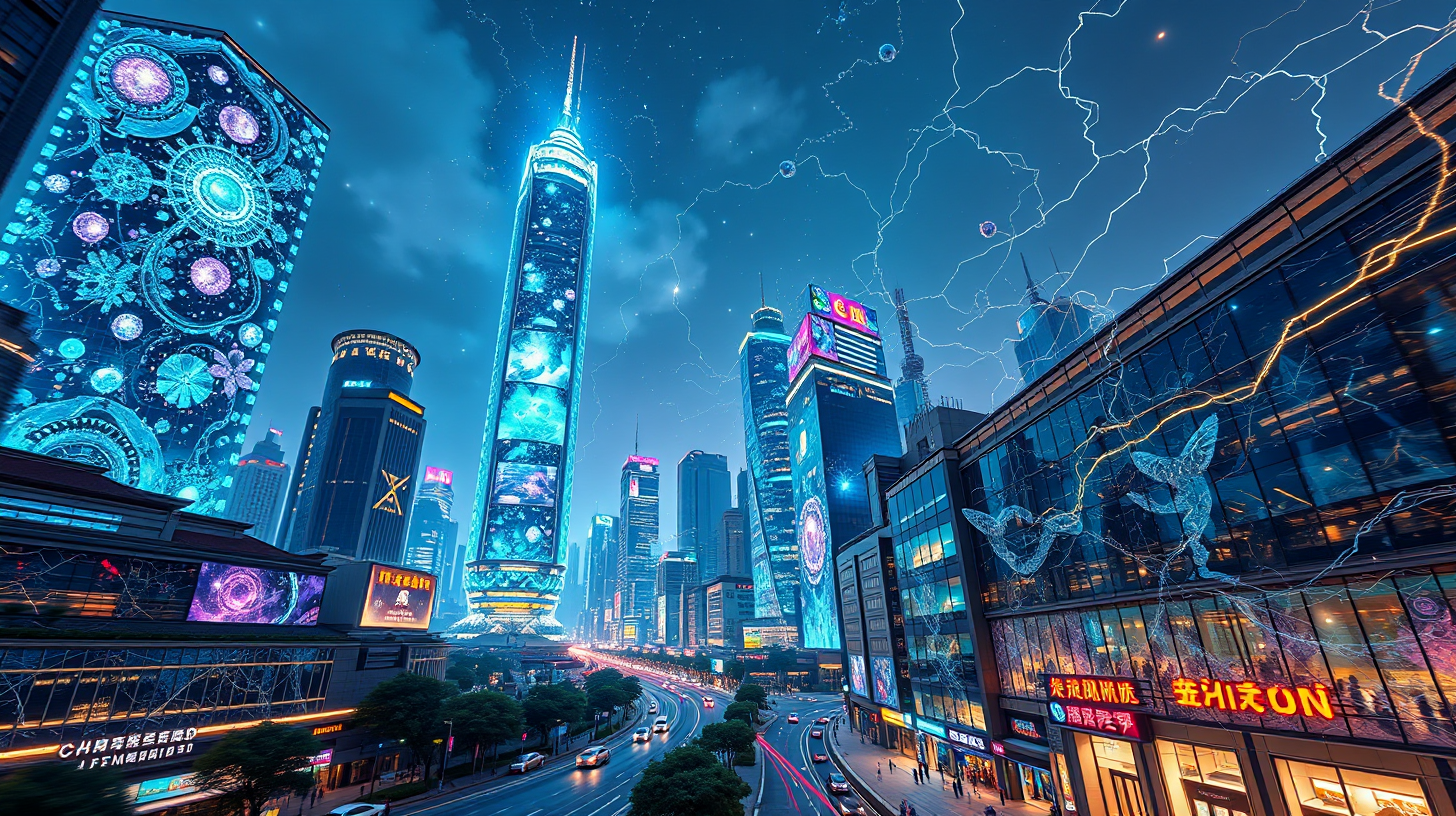 在北京,古老的历史地标与前沿科技碰撞出绚烂的火花。故宫的琉璃瓦不再只是历史的见证,而是浮现出神经网络纹路,太和殿地砖涌出的考古型纳米机器人与少年工程师的神经接口产生共鸣,激活了覆盖中轴线的全息历史投影场,让六百年时空在光粒中解构与重组。钟鼓楼启动模块化重组系统,四合院群如魔方般升空,悬浮走廊交织成脑神经形态,空中花园里的量子茶馆将晨雾编译成记忆拿铁,传统胡同在科技的折叠中焕发新生。奥运塔顶的情感光谱穹顶随着城市情绪指数变幻色彩,市民佩戴神经传感玉佩进行年度脑波交响,鸟巢钢结构随集体情绪生长出发光藤蔓矩阵,科技与情感在此共鸣。大运河故道中,幽蓝光流涌动,人体生物电采集浮岛随水流重组,漕运古船以反重力姿态穿梭,船首像投射出量子修复的运河诗碑,历史的波涛在暗物质运河中翻涌。居庸关城墙化作动态拓扑结构,每块城砖都是记忆胶囊,烽火台投射星环状粒子对撞景观,晨练老人与清洁机甲共舞太极数据流,长城的记忆在拓扑学中重生。CBD建筑群展开光年投影幕墙,国贸三期顶端的神经脉冲塔将全城情绪频率转化为色彩交响,共享痛觉的共情装置在长安街绽放蒲公英光雨,云端之上,共识的核心闪耀着科技与人文的光芒。
