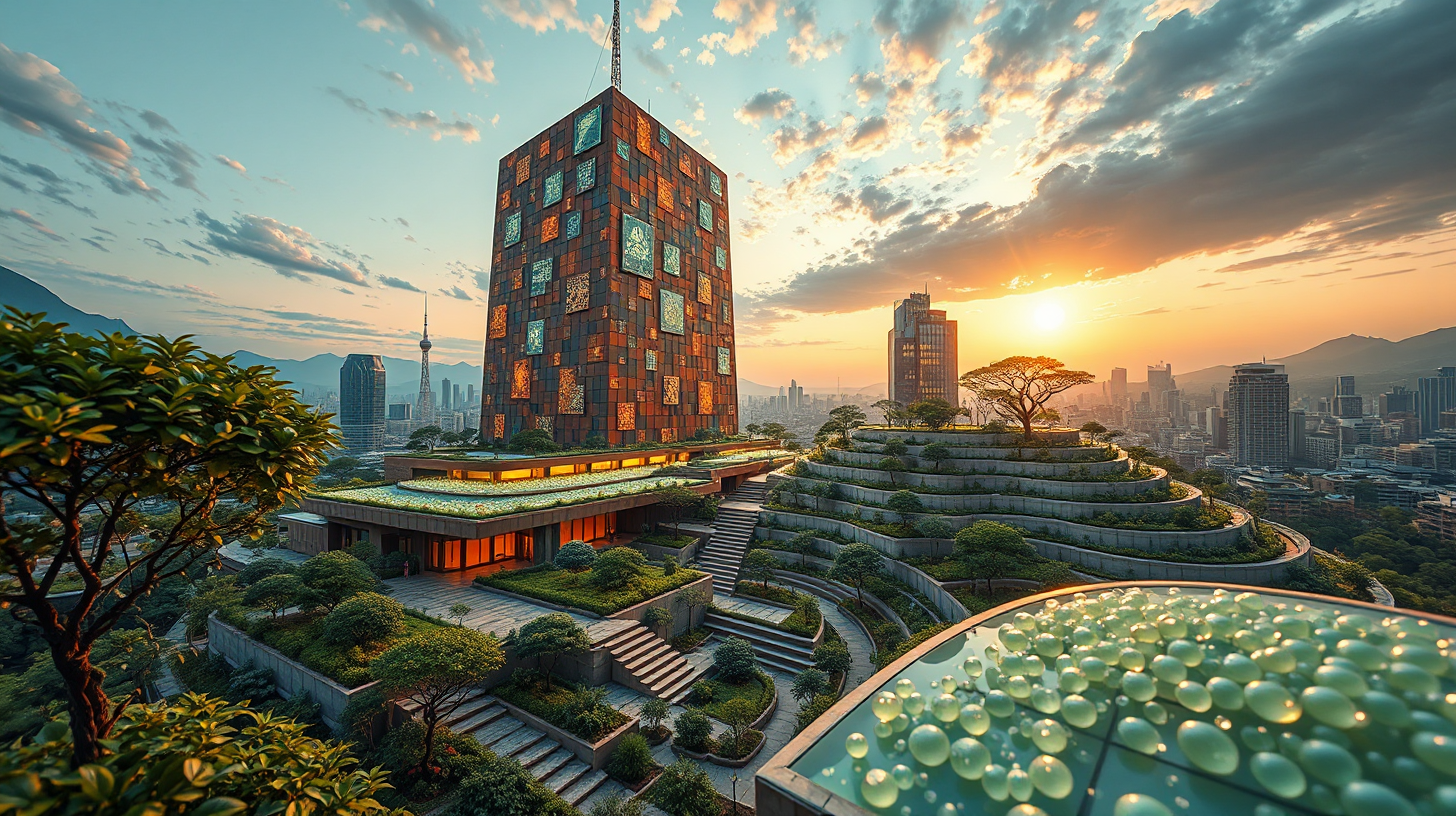 作图提示词:Low-angle perspective of urban core tower with self-regenerating terracotta composite tiles, circadian rhythm-responsive bio-lumina panels embedded in ceramic matrix, harmonic resonance field generating stratified luminosity layers above futuristic Xinyang, photovoltaic ceramic murals encoding cultural memory patterns, tripartite ecological grids channeling bio-kinetic energy through terraced plantations, dusk ambiance with volumetric light scattering through suspended hydrogel particles, macro photography details revealing fractal growth patterns in ceramic substrates, telephoto compression emphasizing structural monumentality, golden-hour sidelighting accentuating surface texturing