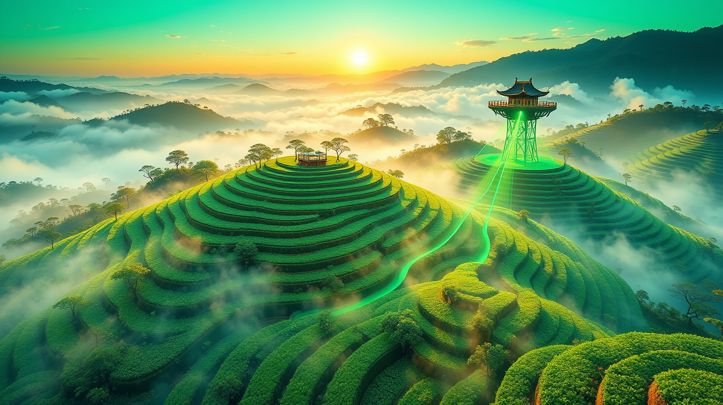 描述:晨曦微露,量子茶田在薄雾中苏醒,数万架悬浮采茶机甲如银色蜻蜓穿梭于层叠梯田。每株茶树的根系都与地底光能网络紧密相连,叶片随着日光角度的变化,折射出从浅绿到墨绿的不同色阶,宛如动态的光谱密码在天地间缓缓铺展。光粒子在晨雾中跳跃,与机械运转的细微嗡鸣、露珠蒸发的簌簌声,共同奏响一曲科技与自然的田园交响。