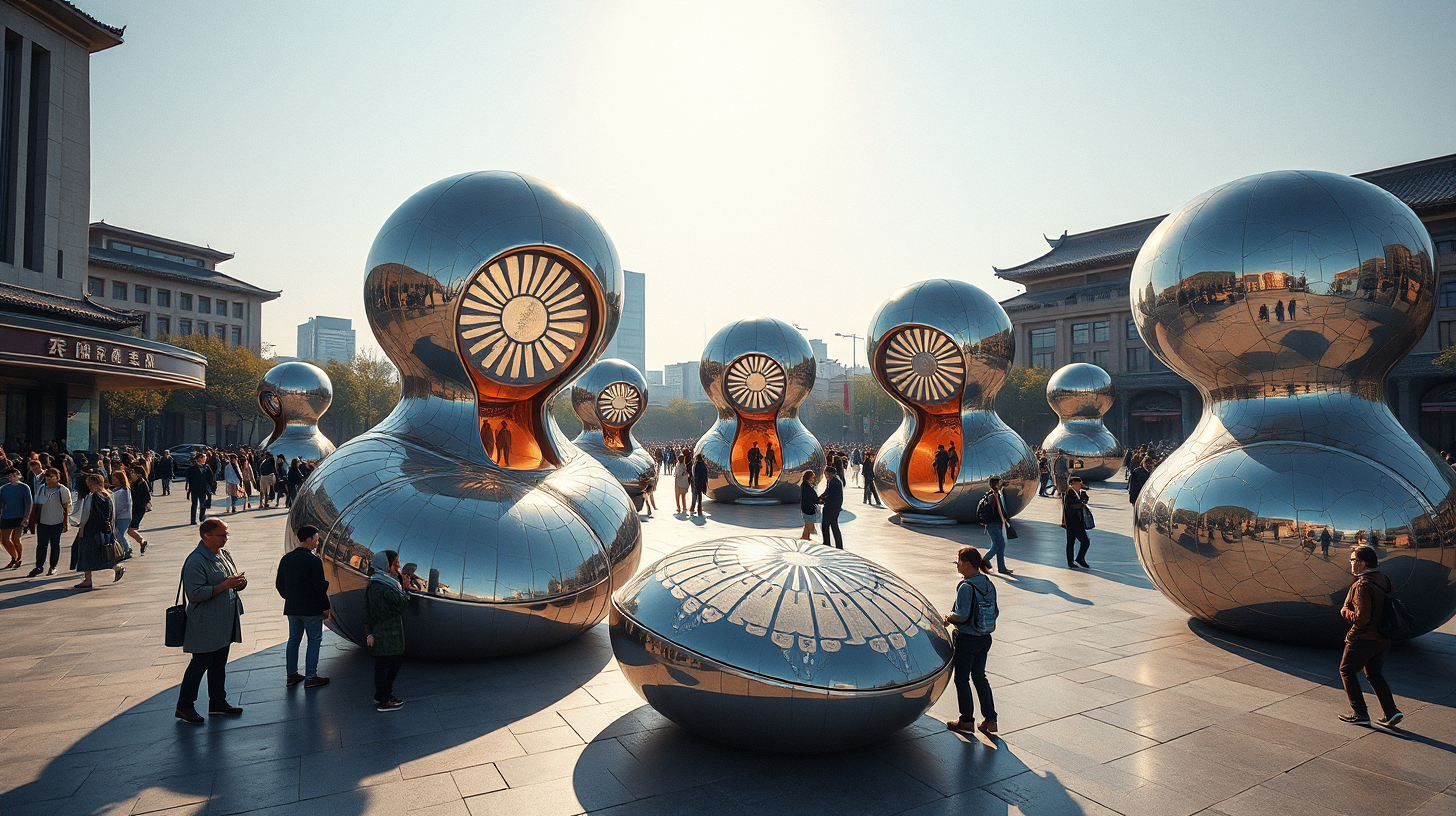作图提示词:Medium format shot of self-reconfiguring nano-alloy sculptures in Xinyang Central Plaza, metallic surfaces reflecting solar patterns into Song dynasty merchant holograms, citizens exchanging neural data packets with chestnut-shaped interfaces, Leica Noctilux-M 75mm f/1.25 capturing sharp shadow play from solar zenith, iridescent patinas cycling through Tang dynasty color palettes