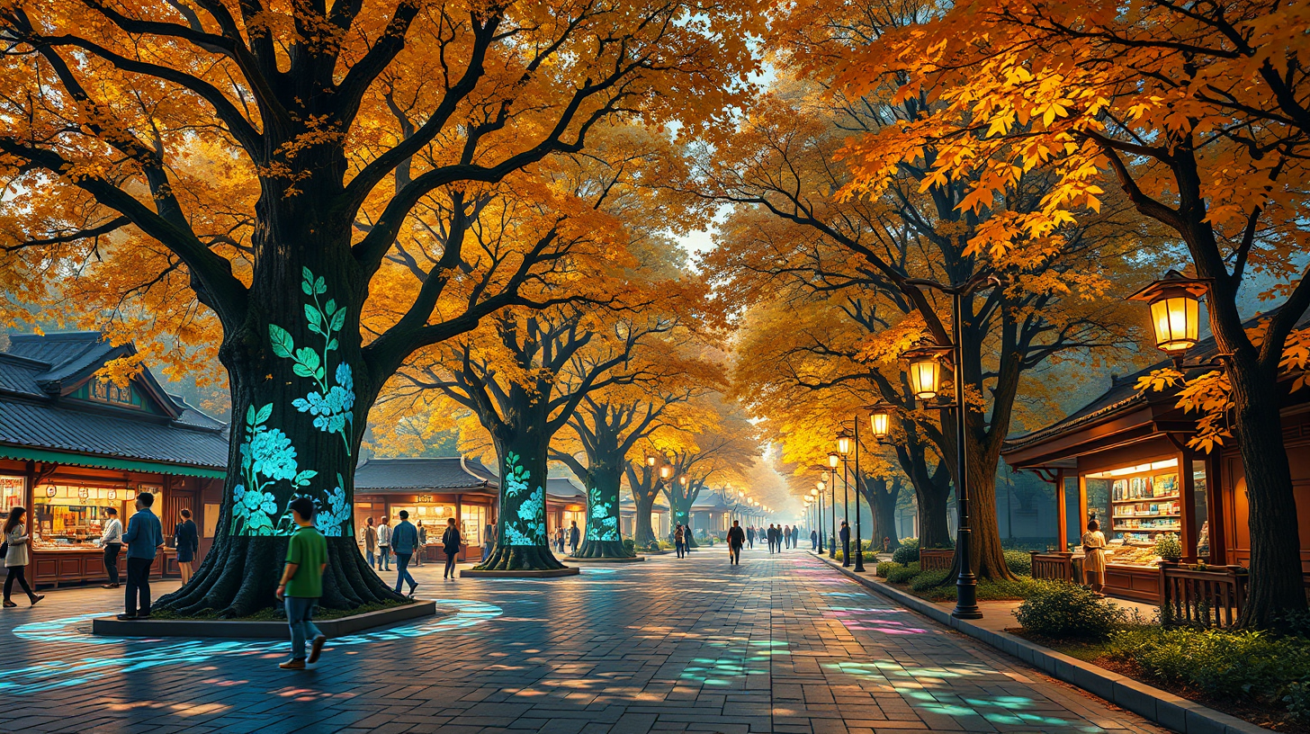 作图提示词:35mm wide shot of bioelectric ginkgo corridor during autumn, trunk-embedded projectors displaying Northern Song dynasty market scenes, photon-emitting leaves creating chromatic interactions with quantum-absorbing pavement, ARRI ALEXA 65 capturing volumetric light beams through golden foliage, smart streetlights mimicking Tang dynasty lantern designs with quantum dot technology