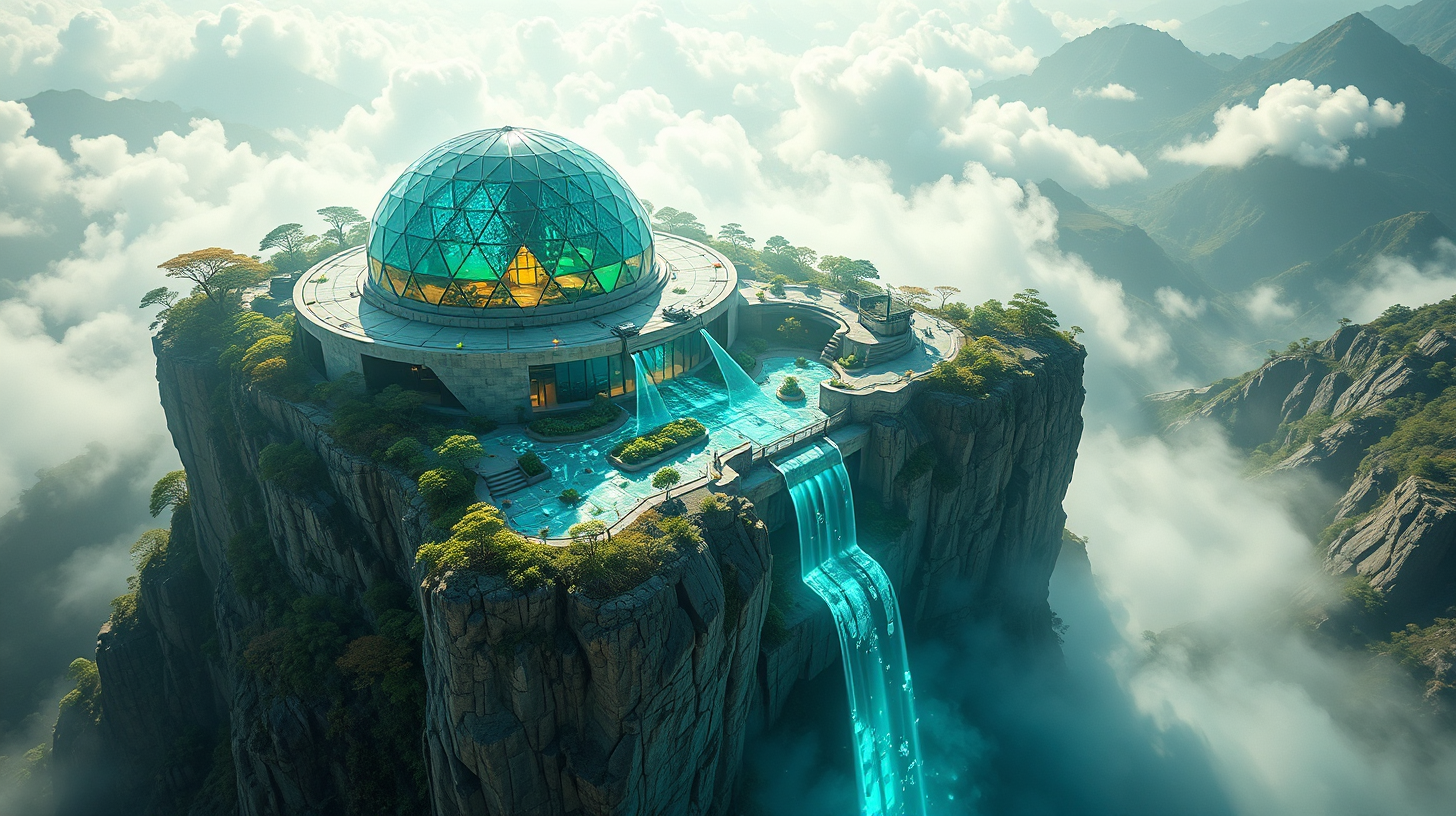 描述:鸡公山悬崖之上,反重力茶艺研习所如琼楼玉宇般悬浮于云雾之中。建筑外壳采用先进的云雾收集材料,实时将水汽转化为量子茶汤,丝丝缕缕的茶香与数据流在空气中弥漫。学徒们操控着气候模拟器,在透明穹顶下上演着二十四节气的光影秀,惊蛰的雷纹、清明的雨丝在薄雾中流转。茶宠机器人沿着虹吸管轨道轻盈穿梭,传递着文化数据胶囊,陶瓷关节碰撞出清脆的声响。冷调的量子蓝光与暖金色的节气投影在云雾中交融,勾勒出建筑的轮廓,营造出一种科技与茶道共鸣的超现实禅意幻境。