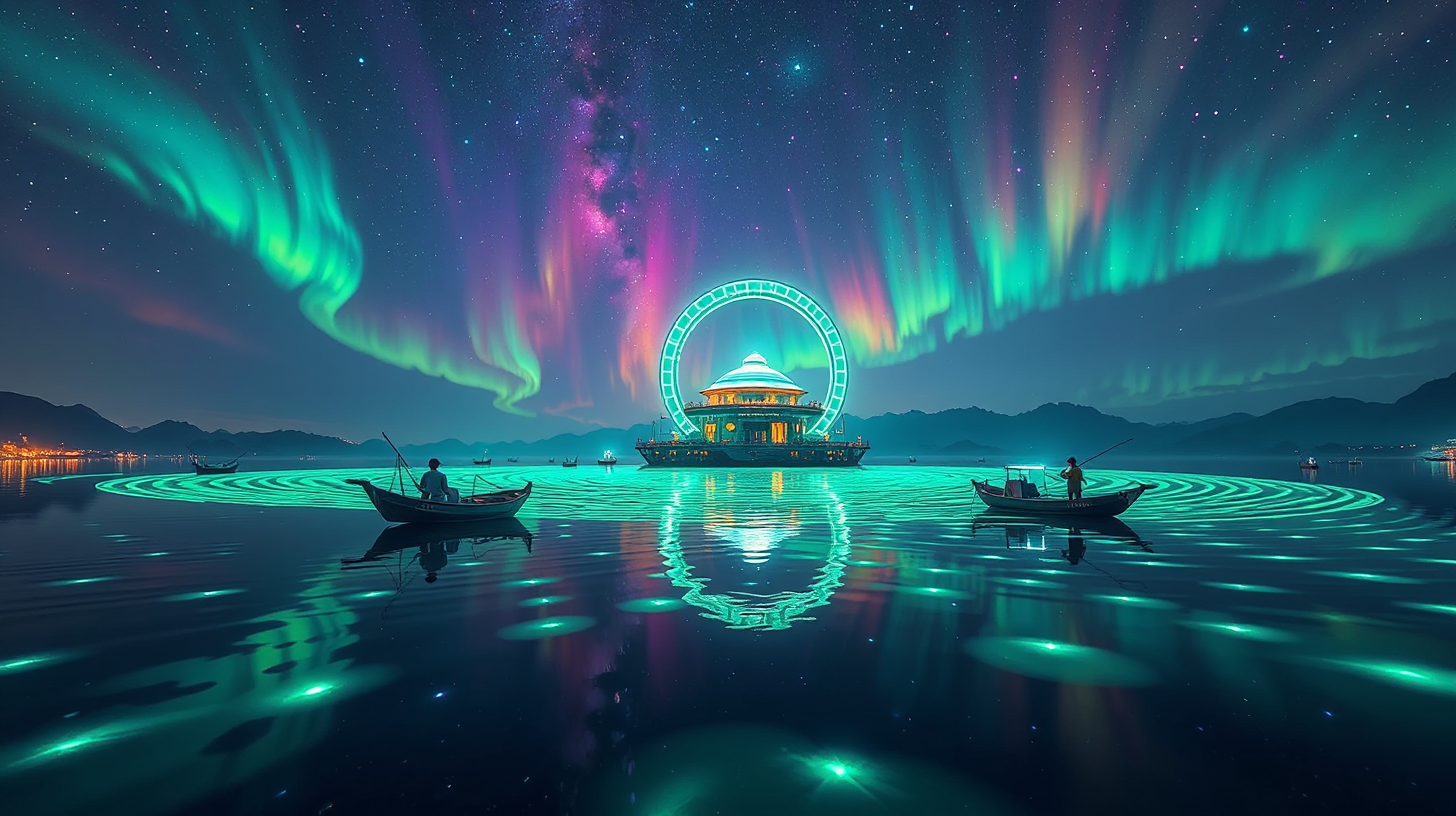 描述:夜幕降临,南湾湖面上,由水体净化纳米机器人构成的星环观测站静静悬浮,冷白的人工星光倒映在碧波之中。渔民用生物电渔灯轻轻唤醒湖底的光藻,刹那间,翠绿的生物荧光与星环的光芒同步闪烁,在湖面勾勒出梦幻的涟漪。一个少年将祖传的采菱船改造成了生态监测站,船头投影着实时水质构成的诗意光纹,光波在水面与空气的界面产生奇妙的干涉图样,潮湿的夜风裹挟着负氧离子的清新气息,演绎着一曲科技与自然的静谧夜之舞。
