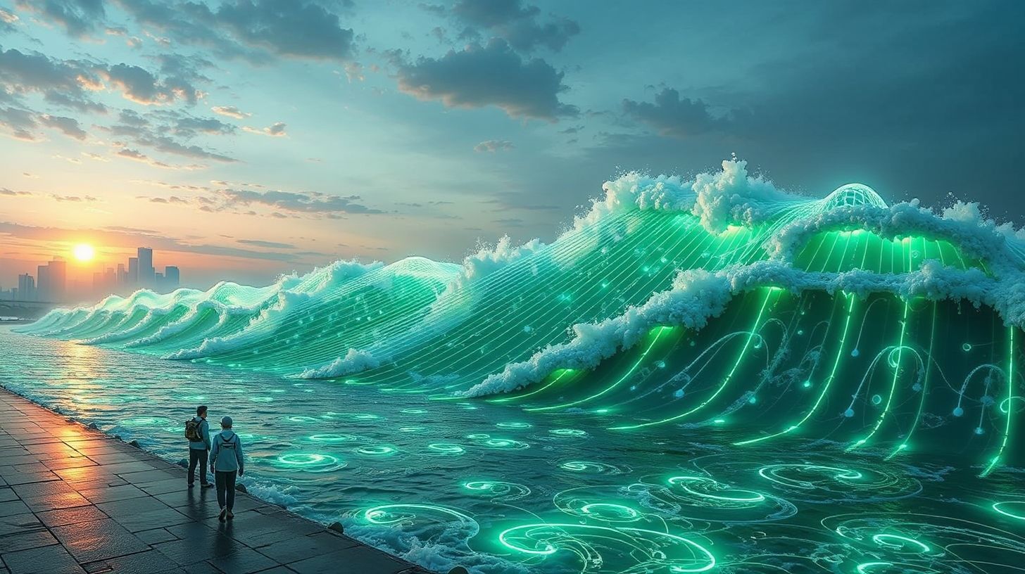 描述:夕阳为钱塘江大潮镀上金边,堤岸下的微型引力调节器启动,形成闪耀的“引力芭蕾”防护网。银发志愿者团队通过脑波系统指挥清洁机器人,编织出光电警示带。当汹涌潮水撞上科技屏障,激起的浪花与光效共舞,古老的观潮传统在未来科技的守护下,成为自然与智慧协奏的壮丽诗篇。