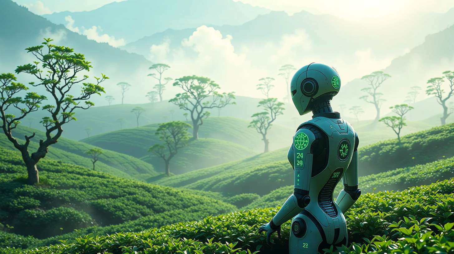 描述:狮峰山上的龙井茶园沐浴在晨露中,每株茶树都植入了生物传感器,形成会“呼吸”的智慧矩阵。云雾生成器在茶垄间吐出轻柔白雾,采茶机器人穿梭其间,手腕上的柔性显示屏流转着二十四节气的光效。当阳光穿透薄雾,叶片上的传感器闪烁微光,传统茶田化作科技与农耕共生的绿色诗篇。