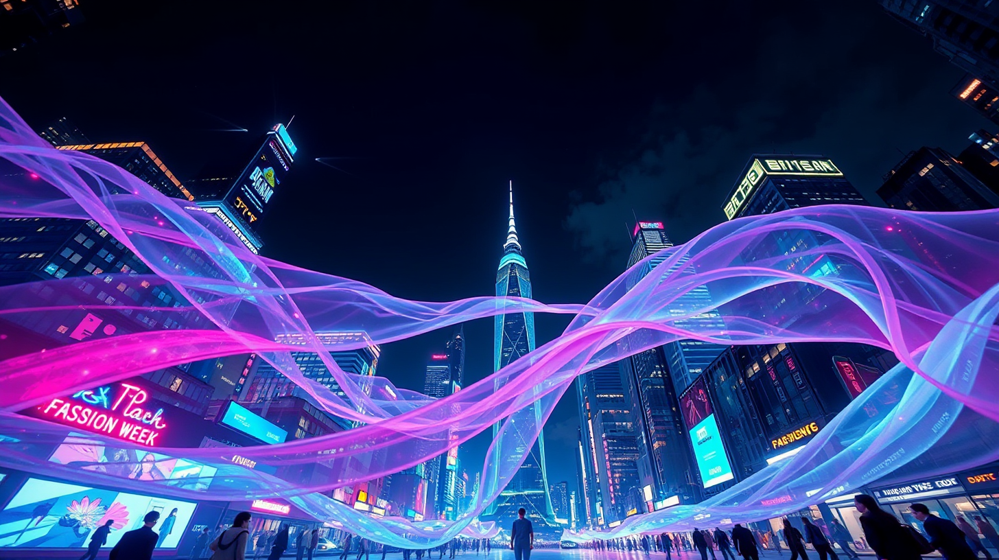 作图提示词:A stunning low-angle view of the city skyline at night, intelligent material ‘digital silk’ floating in the air, capturing fashion week design data in real-time and automatically weaving it into dynamic fashion shows, neon lights reflecting off the sleek surfaces, vibrant and energetic mood, ultra-wide shot, demonstrating the fusion of traditional textile concepts with futuristic technology in urban environments.