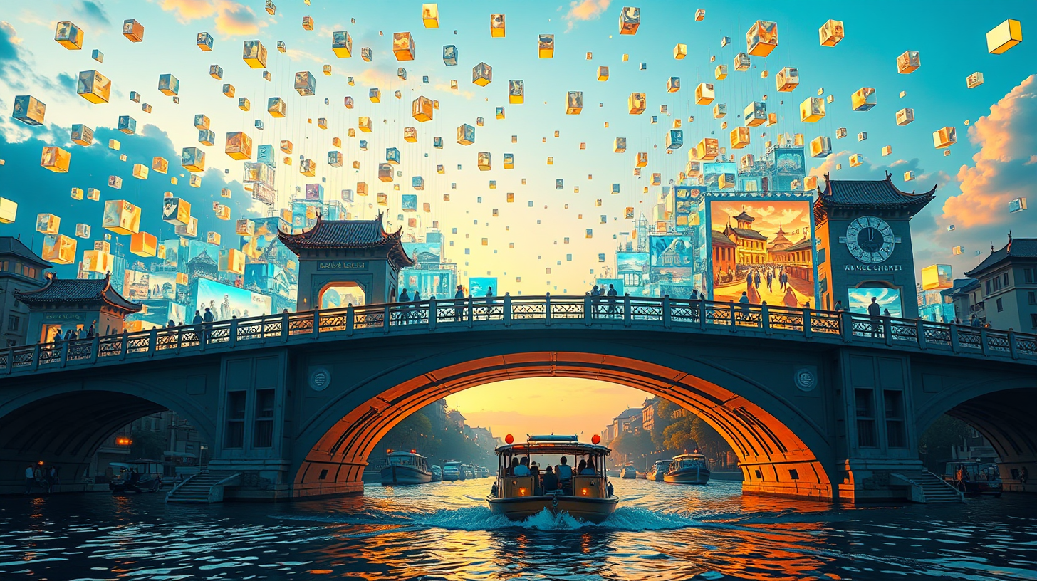 描述:黄昏时分,拱宸桥畔升起无数发光立方体,如同悬浮的记忆水晶。每个立方体都封存着运河千年的故事,当游船穿过桥洞,量子投影仪将漕运商船的历史影像与现代街景叠映,河面顿时浮现虚实交织的时光画卷。古老石桥与未来光影共振,让运河的记忆在暮色中焕发新生。