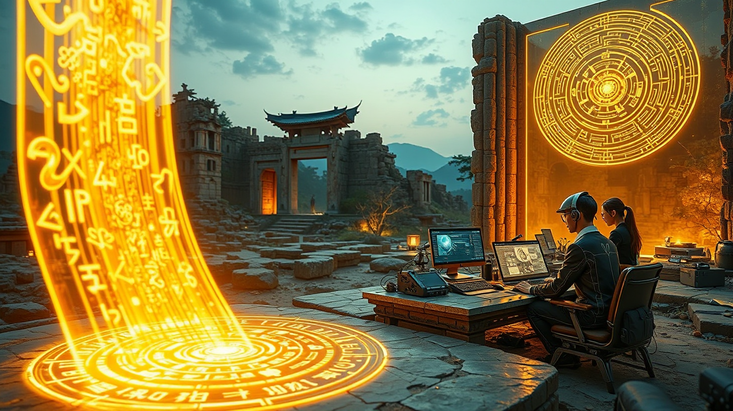 描述:良渚遗址在暮色中闪耀着科技金光,考古型纳米机器人如金色洪流,将五千年前的玉器纹样解码为跃动的立体光码。程序员们通过增强现实界面编译这些古老符号,当指尖划过全息屏幕,玉琮上的神人兽面纹化作可交互的数字图腾。古老文明在科技之光中苏醒,讲述着未被时光掩埋的秘密。