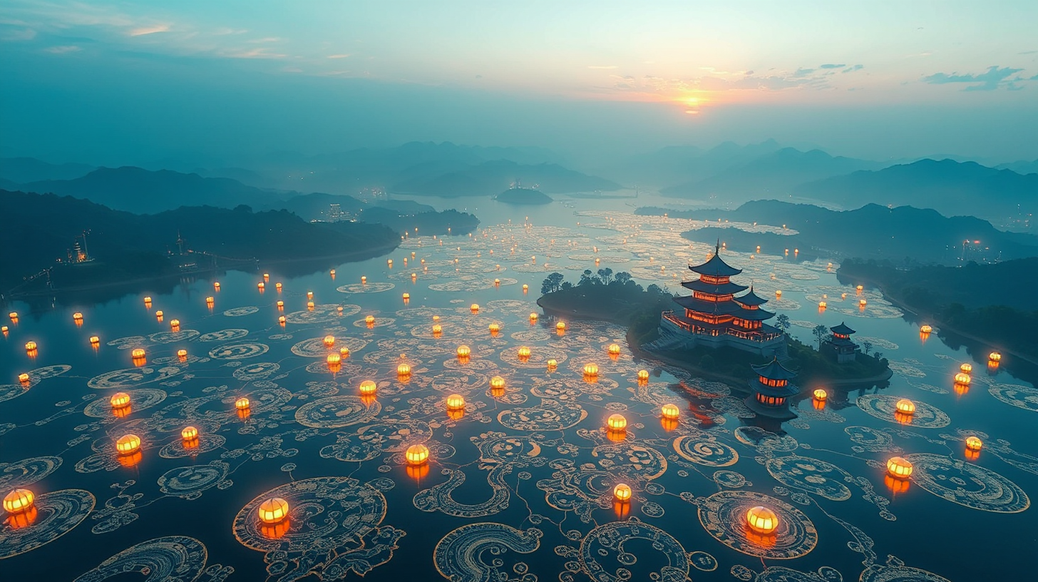 作图提示词:A breathtaking aerial view of West Lake at dawn, with nanoscale ecological buoys forming an intelligent water network, dynamic light patterns shimmering on the water surface, creating a holographic scroll of ancient poetry, vibrant colors reflecting the morning light, serene and futuristic atmosphere, ultra-detailed, cinematic lighting, ultra-wide shot, showcasing the harmony between advanced technology and traditional Chinese culture in a modern setting.