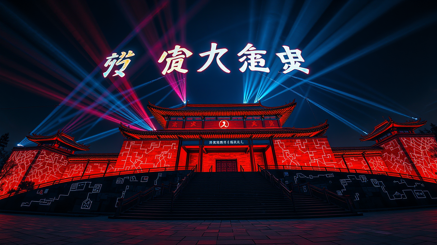 作图提示词:A cyberpunk-inspired red memorial hall in Xinyang, Henan, featuring photon-infused brick walls that pulse with rhythmic light patterns resembling blood flow, set against a night sky illuminated by massive topological light networks that project pulsed beams forming revolutionary slogans in mid-air. Captured from an ultra-wide low-angle perspective, the scene combines vibrant neon hues with traditional Chinese architectural elements, creating an awe-inspiring contrast between dark skies and energetic light emissions. The composition emphasizes the building’s imposing scale through dramatic foreshortening, with depth of field focusing sharply on the photon walls while allowing the light networks to blur slightly into the background, suggesting vast scale. Lighting employs high-dynamic-range contrast between the neon elements and dark surroundings, with color grading emphasizing crimson reds and electric blues.