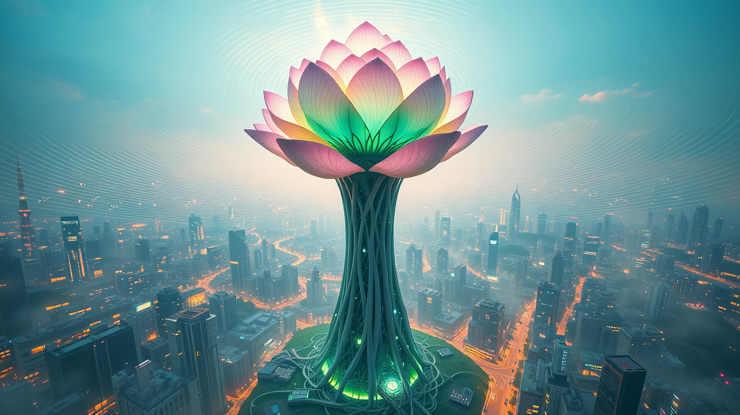 作图提示词:A towering neural structure in the shape of an unfolding tea bud at the heart of futuristic Xinyang, emitting visible mind-wave ripples that distort the surrounding air, crowned by a massive quantum tea flower projection whose translucent petals bloom outward to envelop the cityscape. Shot from an elevated aerial perspective, the composition frames the tower as the central focal point with concentric energy waves radiating outward, using a shallow depth of field to keep the tower’s intricate details sharp while softening the urban background. The color palette blends jade green and soft pink energy emissions with the warm glow of city lights below, captured with long exposure to emphasize the motion of the flowing petals. The scene balances organic curvature with cybernetic precision in its architectural details, rendered in ultra-high definition to showcase both the biological inspiration and technological complexity of the structure. Lighting employs ethereal glow effects with subtle lens flares to enhance the otherworldly atmosphere.