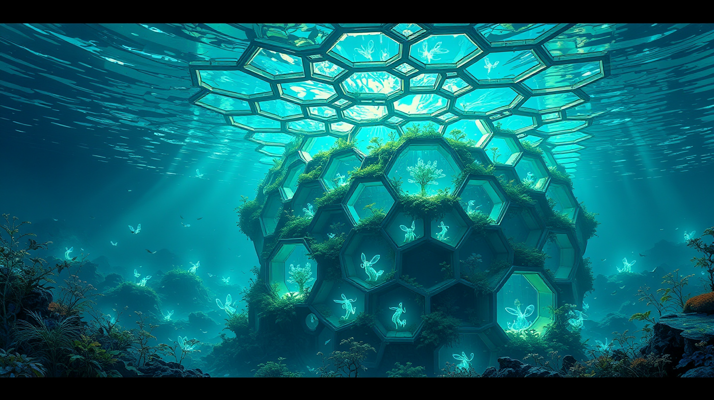 作图提示词:A mesmerizing underwater view of honeycomb-shaped water purification matrix rising from Nanwan Lake depths, each hexagonal chamber nurturing glowing ecological restoration sprites, ethereal blue-green illumination, intricate sci-fi ecosystem, medium shot with crystal clear water details showing Chu Kingdom artifacts integrated with bioluminescent nanotechnology