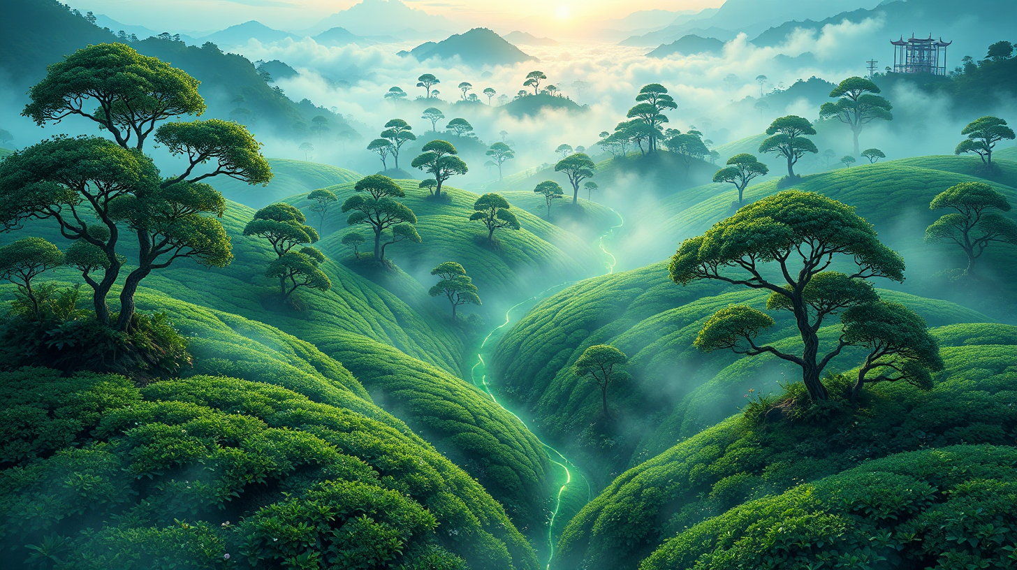 作图提示词:A breathtaking aerial view of Xinyang Maojian tea plantation at dawn, ancient tea trees shrouded in morning mist, nanoscale irrigation system creating glowing data streams along leaf veins, harmonious fusion of technology and nature, vibrant green and blue color palette, ethereal atmosphere, ultra-detailed botanical illustration style, incorporating 22nd-century sustainable agriculture tech with Song Dynasty tea culture aesthetics