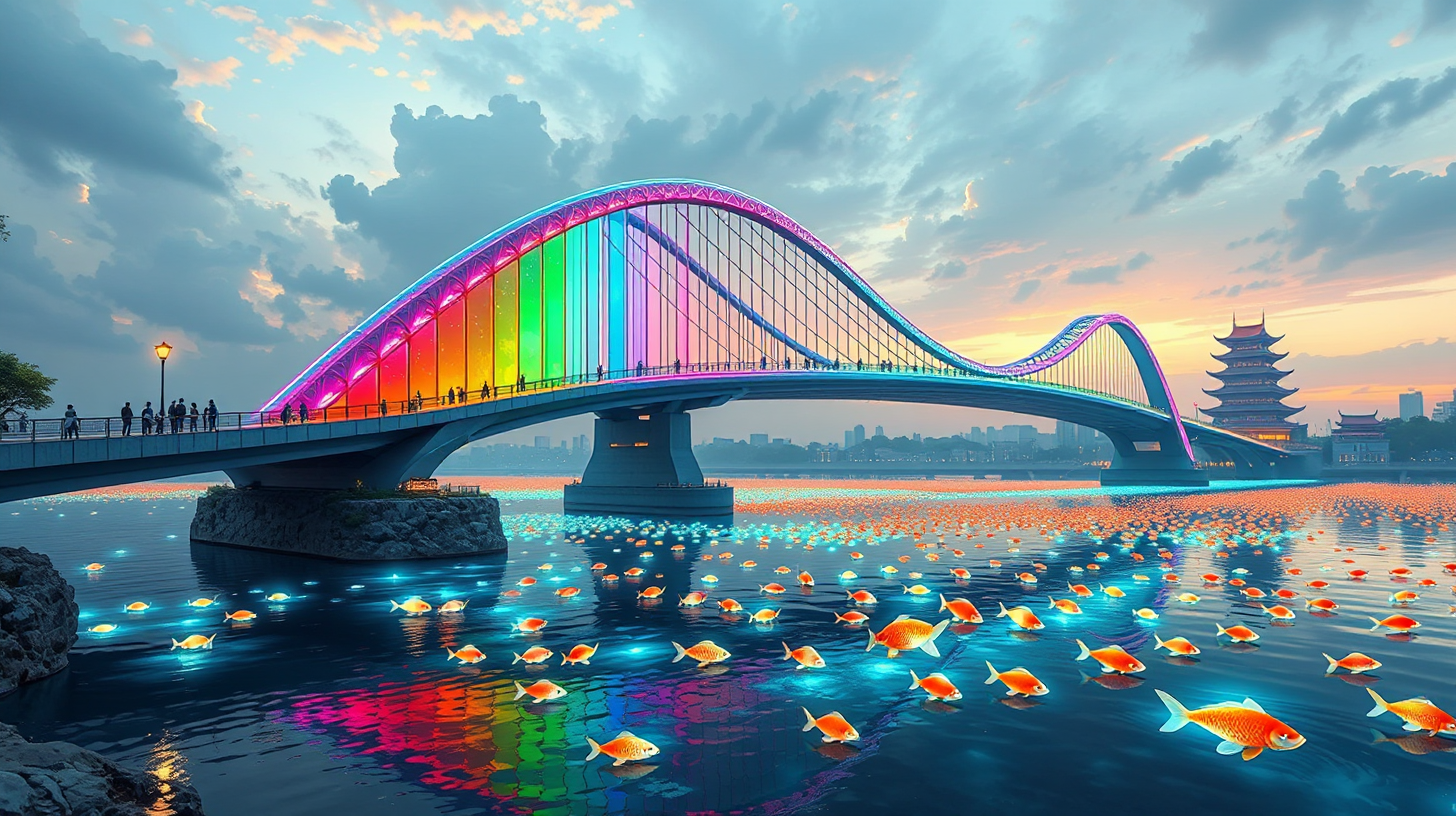 作图提示词:A dynamic side view of quantum rainbow bridge spanning Shi River, bridge surface transforming colors with pedestrians’ emotions, ecological sensors converting water quality data into schools of glowing fish, futuristic architecture with traditional Chinese elements, vibrant multicolor reflections on water, cinematic lighting, ultra-wide shot showing Ming Dynasty architectural influences merged with quantum computing interfaces