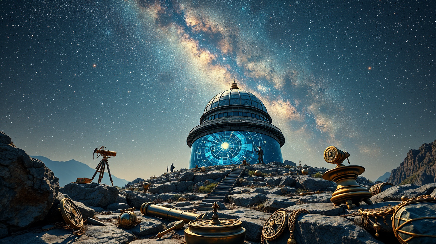 作图提示词:A majestic low-angle shot of ancient astronomical instruments resonating with star track observatory on Jigong Mountain summit, rotating galaxy relief emerging from rock surfaces, celestial bronze artifacts against starry sky, cosmic blue and gold color scheme, epic scale, highly detailed astrophotography style blending Han Dynasty instruments with holographic star projection tech