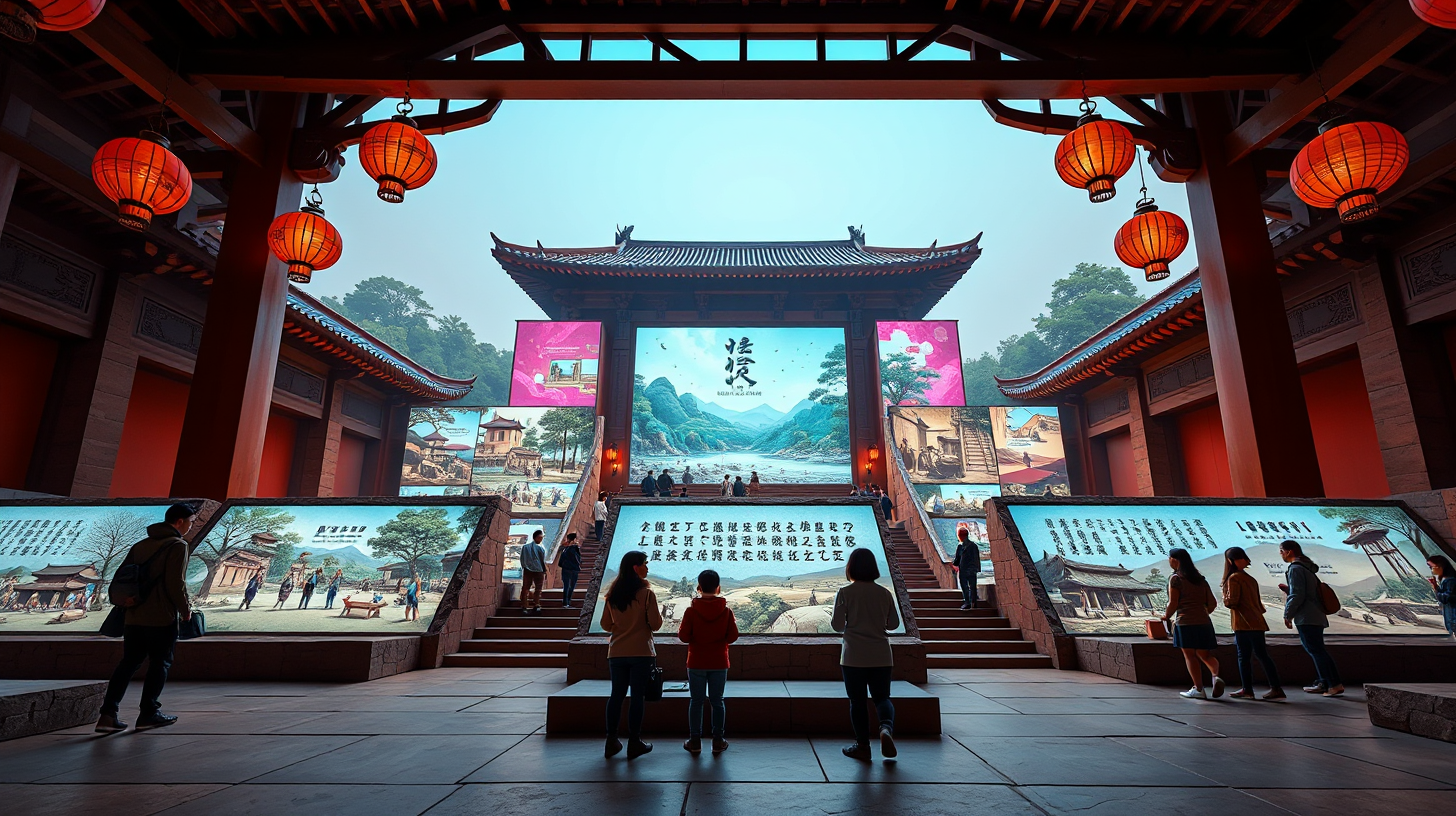 作图提示词:A captivating low-angle shot of Lord Bao’s Memorial Temple’s smart stone slabs, which come alive with dynamic historical projections responding to visitors’ movements. When multiple visitors gather, the slabs synchronize to form continuous narrative scrolls, while children’s laughter triggers augmented reality anti-corruption games. Lighting: warm traditional lantern glow contrasting with vibrant digital displays. Composition: Dutch angle emphasizing both the ancient architecture and interactive surfaces, shot with a tilt-shift lens to maintain focus across multiple planes. Color scheme: rich earth tones with pops of digital cyan and magenta.
