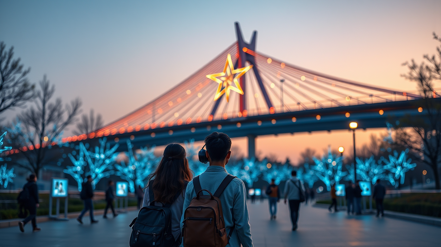 作图提示词:An evolved cultural park in Hefei at dusk, featuring an artistic starbridge installation incorporating subtle kinetic elements and LED lighting. Visitors interact with augmented reality stations that visualize cultural connections between past and future. Shot with a 35mm prime lens at f/2.8 to isolate subjects against the bokeh of bridge lights, using a three-point lighting setup with cool blue backlighting and warm orange fill. Composition follows the rule of thirds with the bridge occupying the upper frame, while long exposure (1/15s) captures light trails from the moving installation.