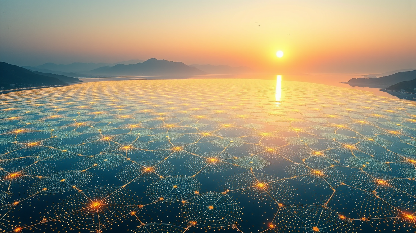 描述:晨曦为巢湖镀上金纱时,湖面浮起万千发光粒子,如银河碎落般编织成动态光纹网络。渔民老张的智能渔网在水波中轻颤,网眼闪烁的传感器自动标记鱼群轨迹,同时将氨氮含量等水质数据以蓝光脉冲形式传向城市生态中枢,古老渔歌与电子蜂鸣在晨雾中谱出奇妙和弦。