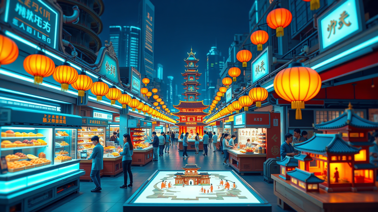 作图提示词:A vibrant night market in futuristic Hefei, featuring smart food stalls with subtle LED health indicators, surrounded by traditional Chinese lanterns. Interactive tabletops display miniature Hui-style architectural projections synchronized with Huangmei opera performances. Captured with a wide-angle lens (24mm) showing deep depth-of-field, using a mix of neon fill lights and warm lantern key lighting to create dynamic contrast. Color palette balances cyberpunk blues with traditional red accents, shot at f/8 for sharp detail throughout the scene.